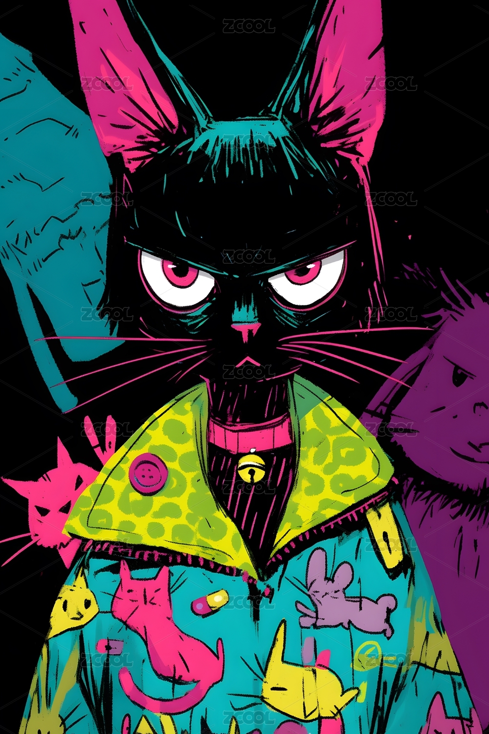 猫,黑猫,宠物,吉祥,涂鸦,粉色,黄色,赛博朋克,未来感,末日