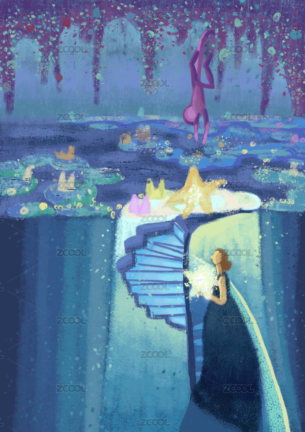 白色的小人脚边放着一颗心,站在美丽璀璨的星空中,蓝色的唯美细腻的情感插画