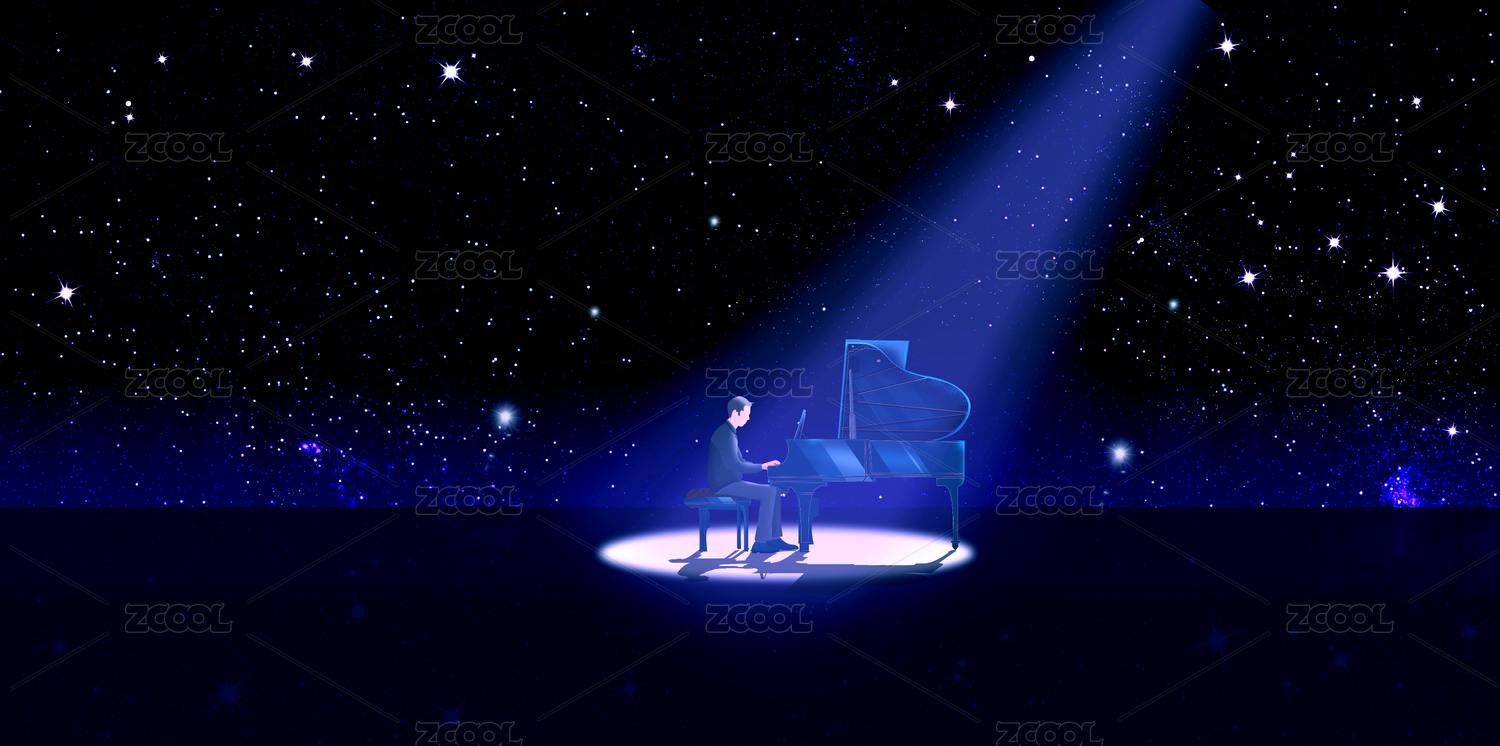 一位穿燕尾服的音乐家在舞台上弹钢琴,灯光射灯打在他身上插画