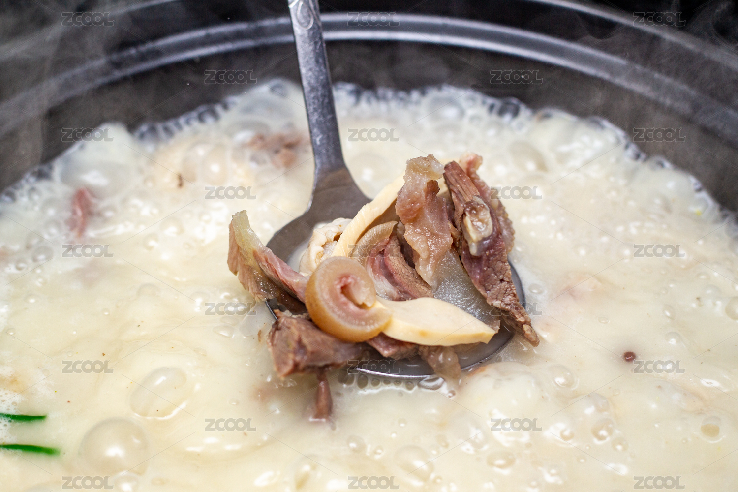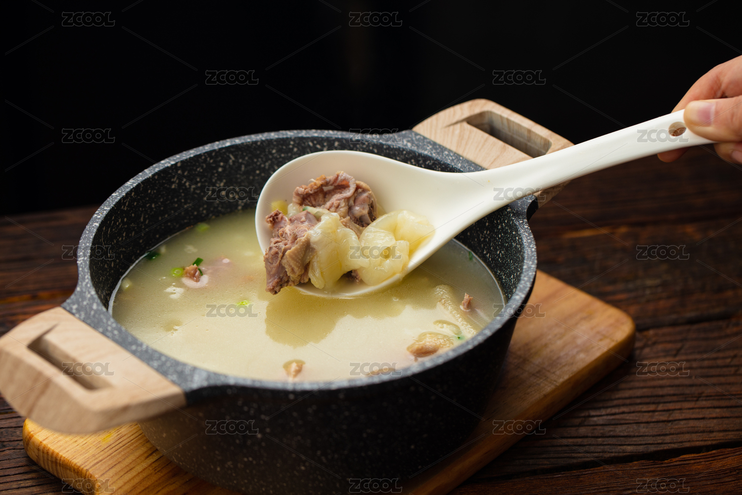一只铁勺从热气腾腾的肉饼汤中舀出一块肉饼
