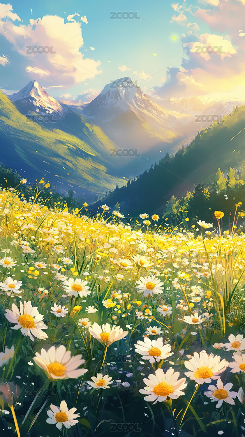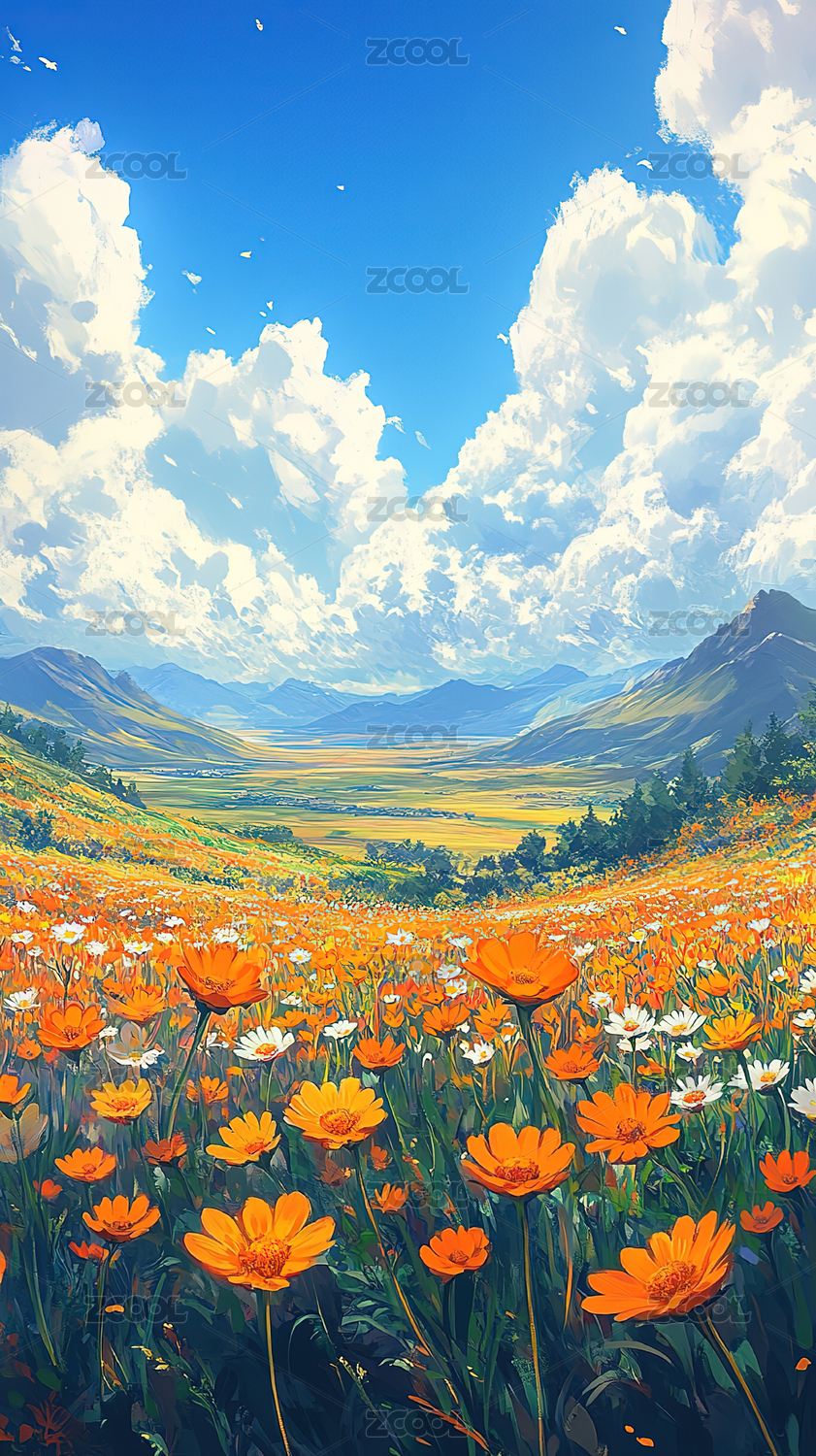 山谷花海唯美风景插画