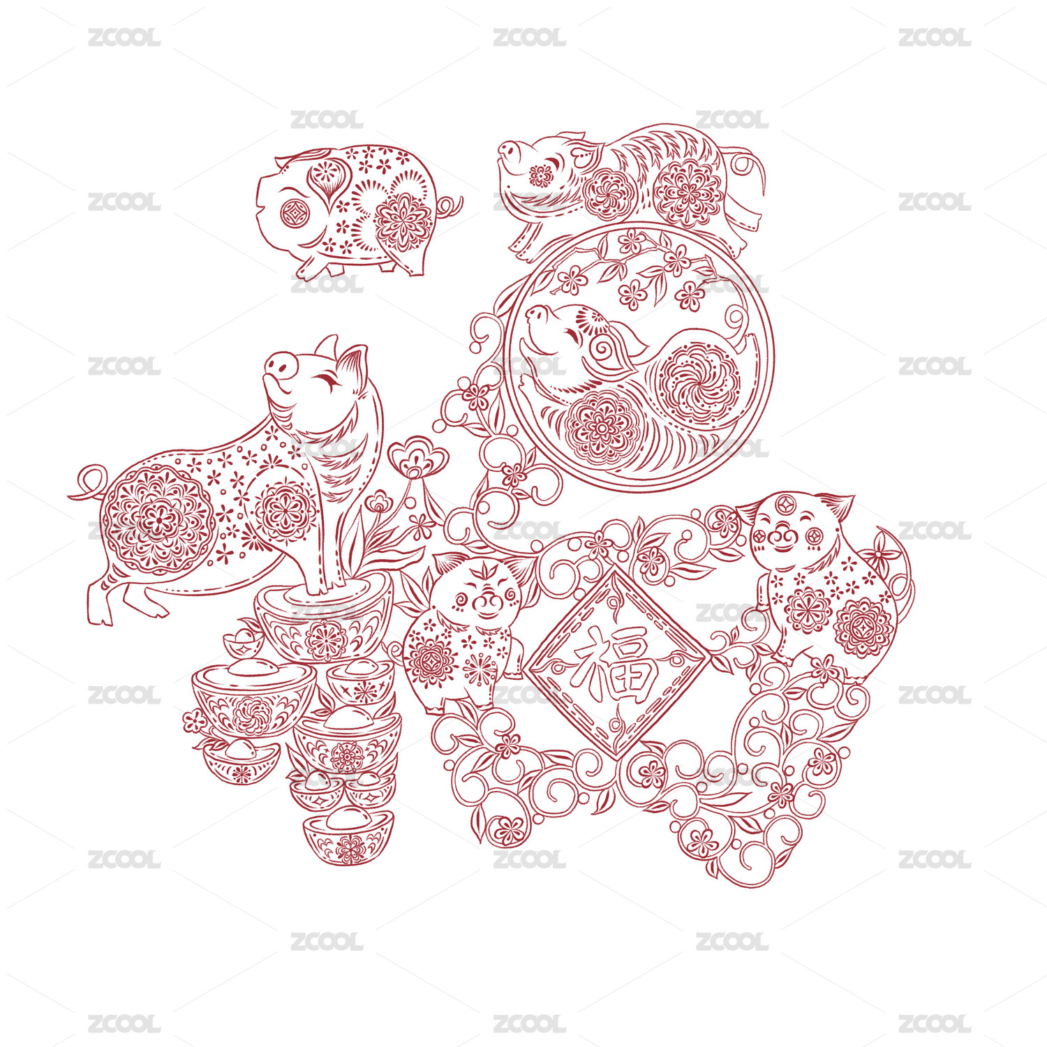 装饰画十二生肖动物插图黑白插画线描中国传统装饰纹样,白色,白色背景,设计,风格,一只动物,中国文化,传统,传统文化,工艺品
