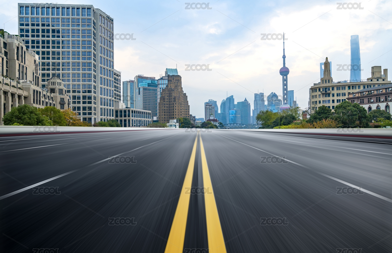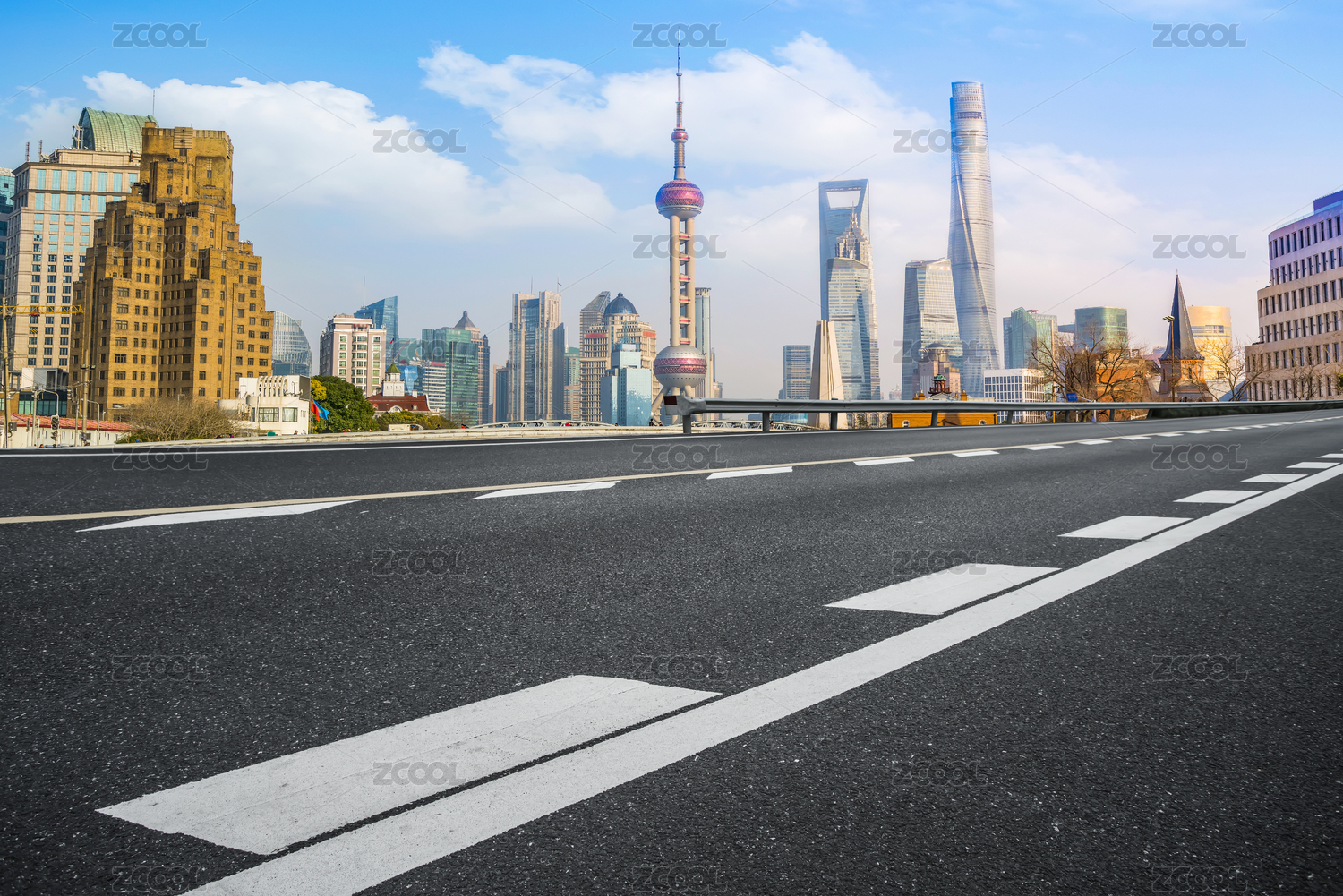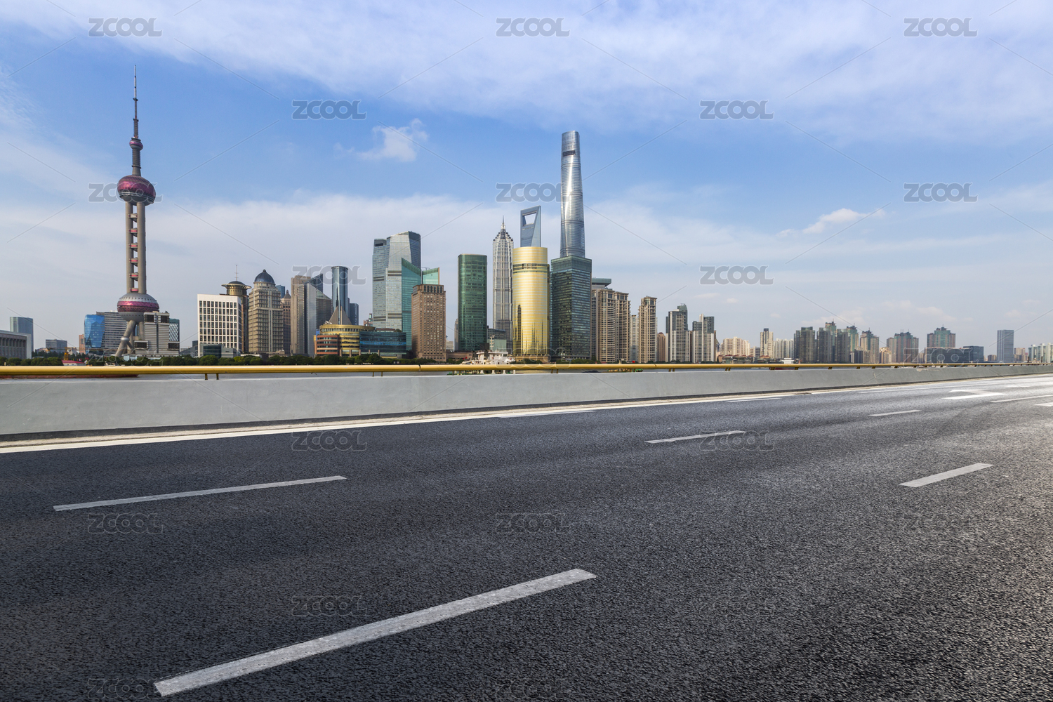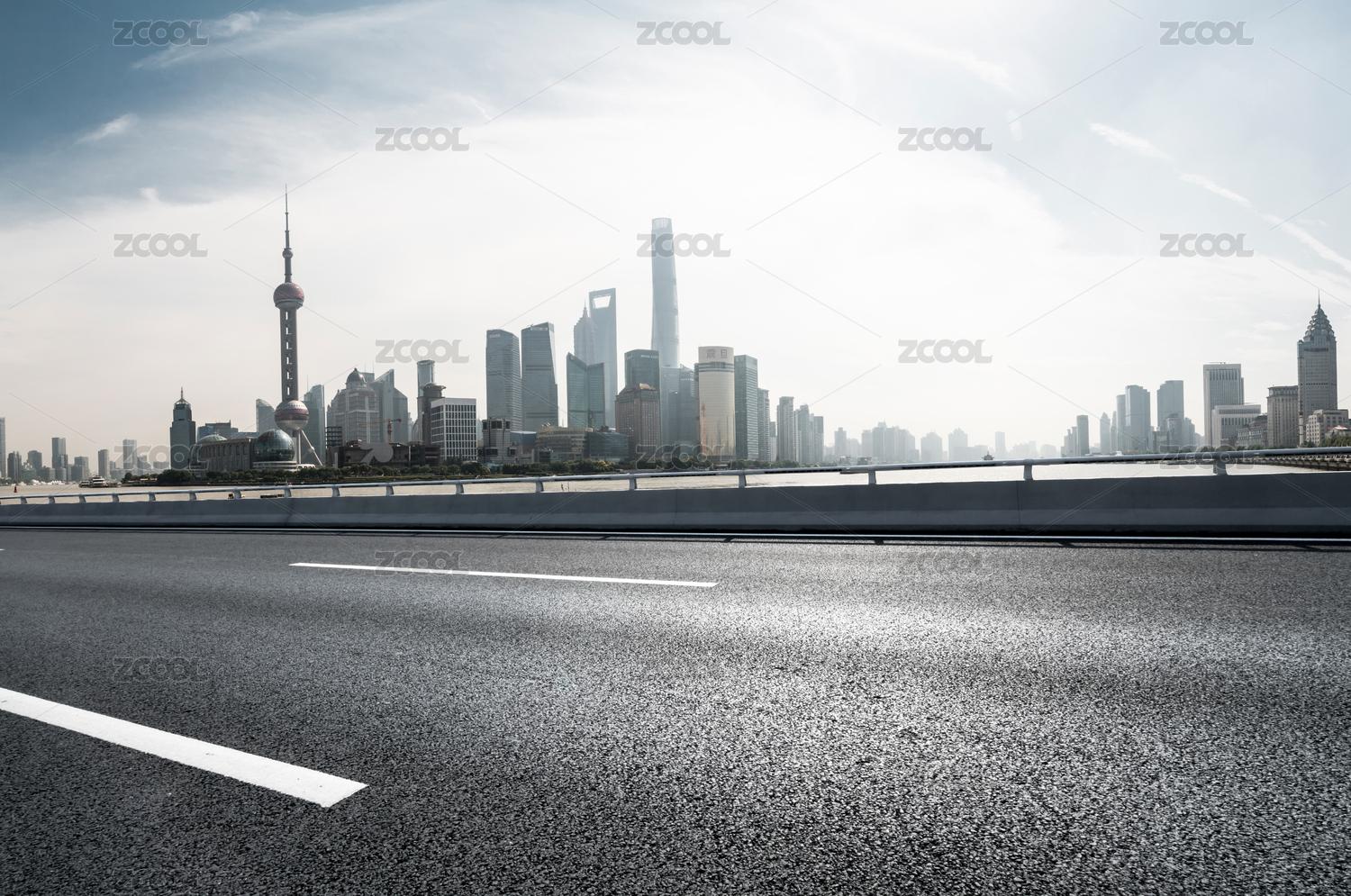 沥青高速公路天际线和上海陆家嘴现代建筑