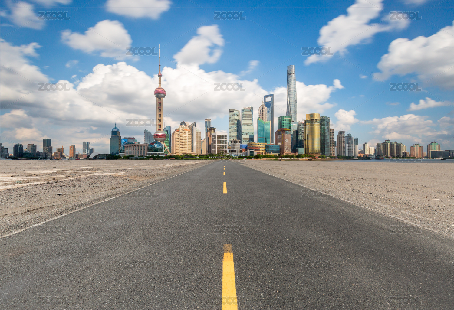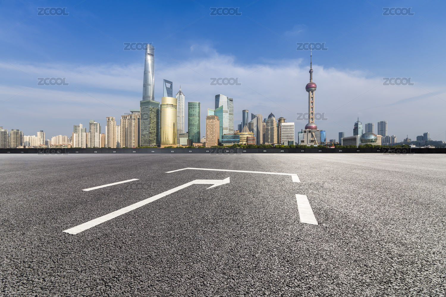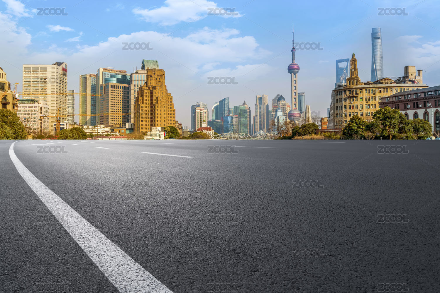 空旷的柏油路和上海的城市景观天际线