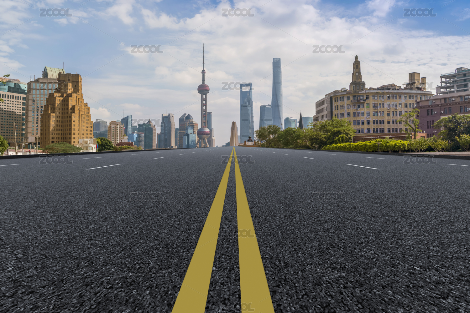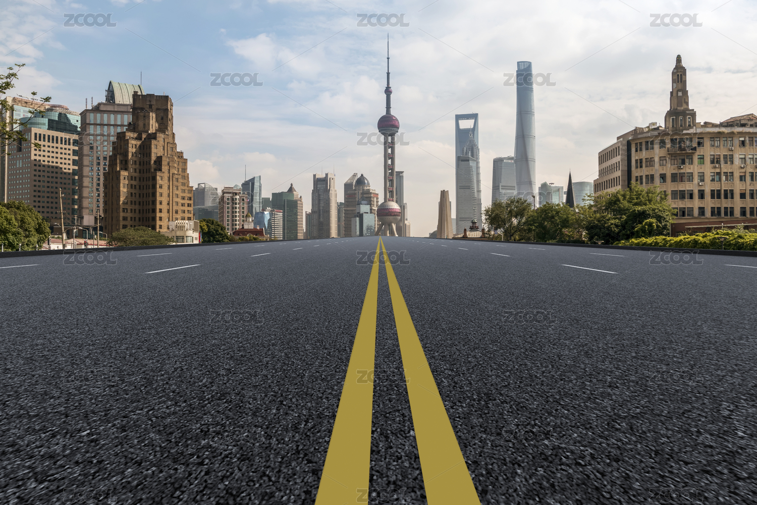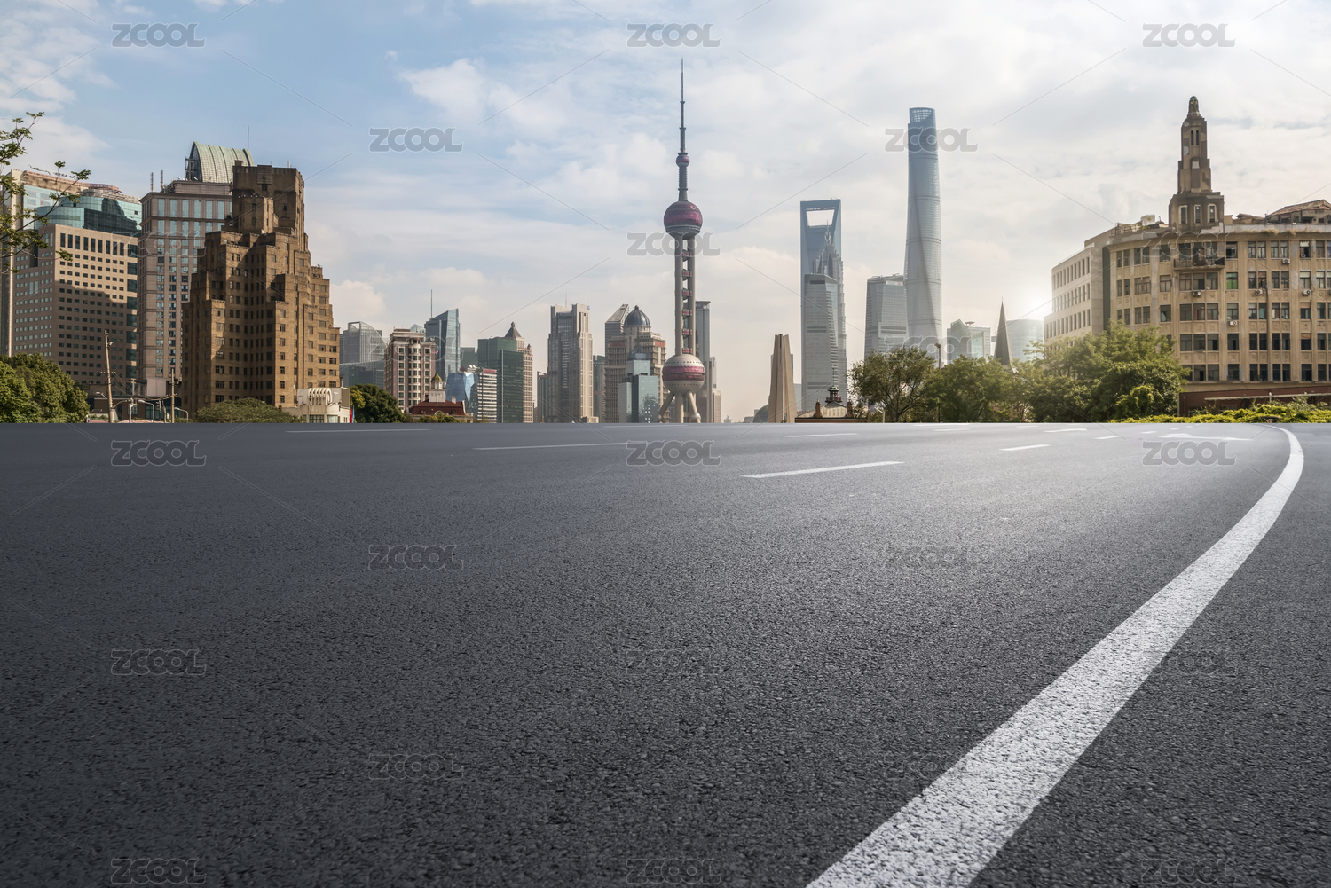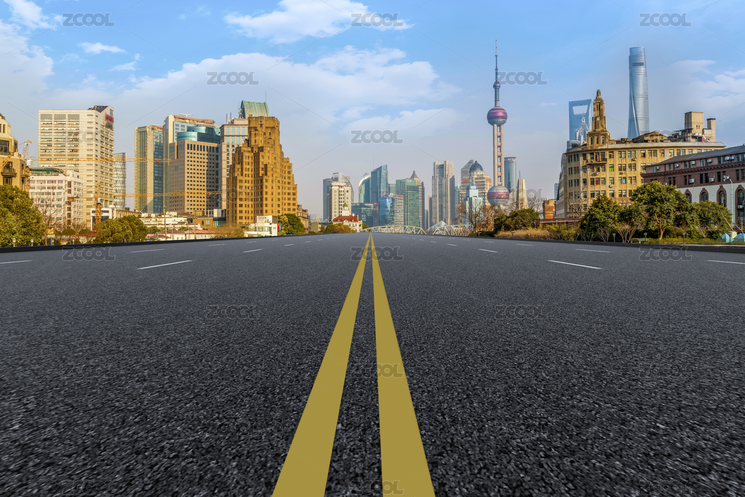 空旷的柏油路和上海的城市景观天际线