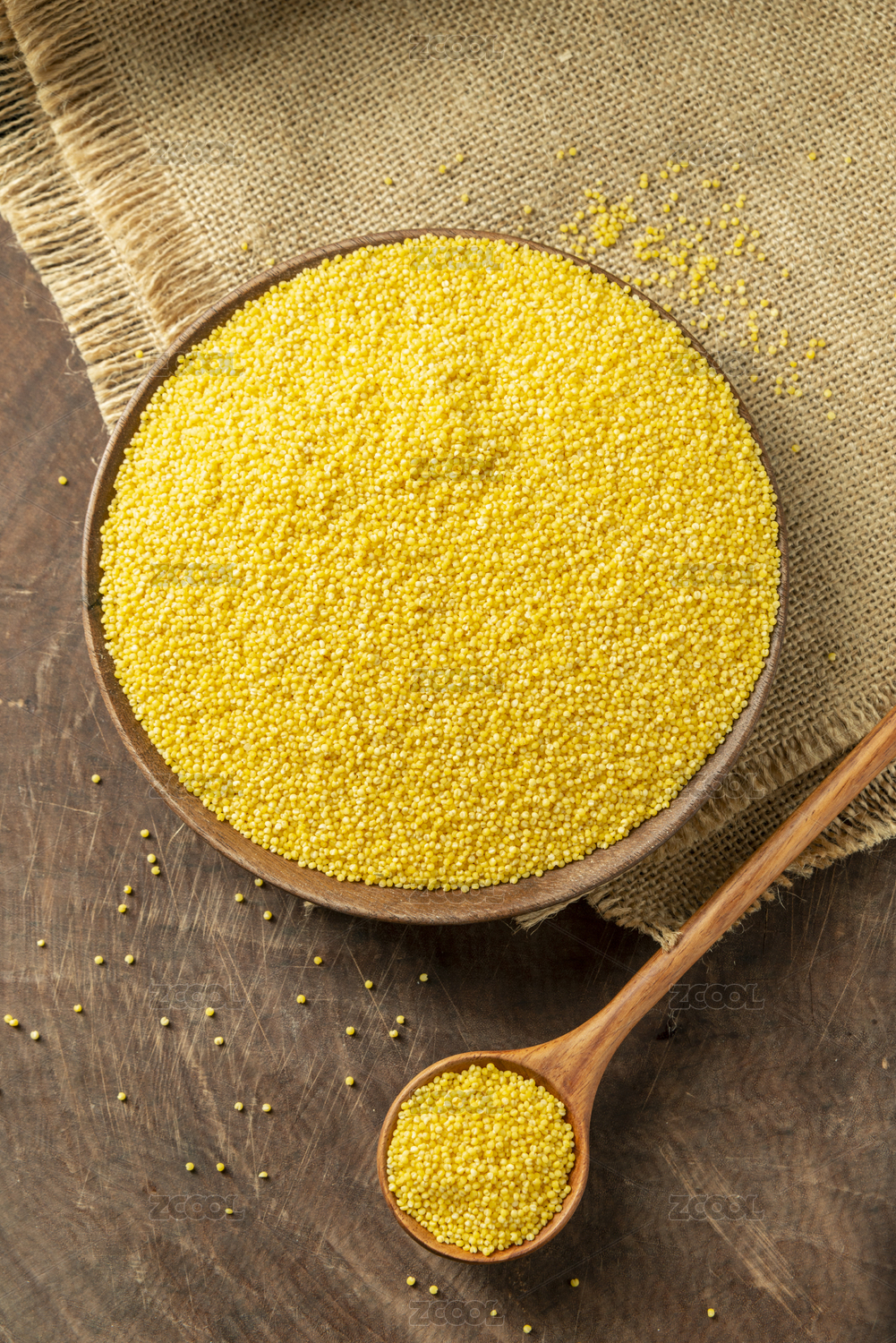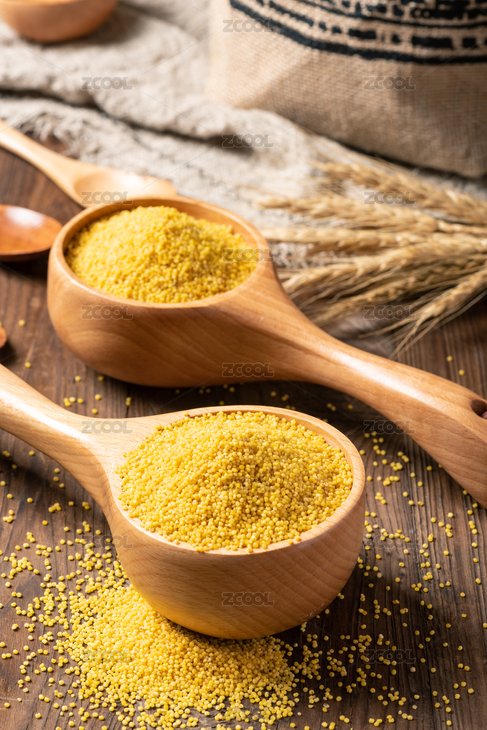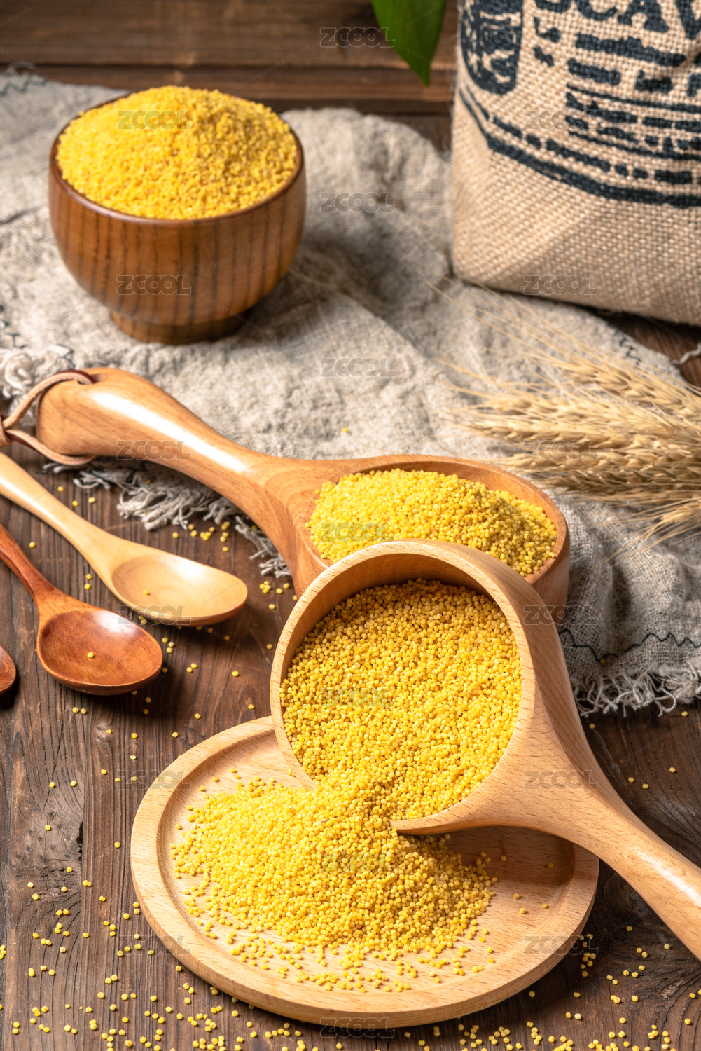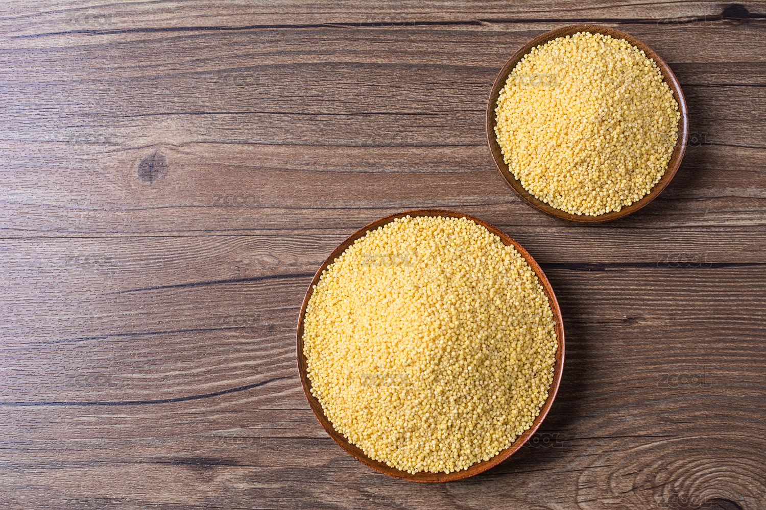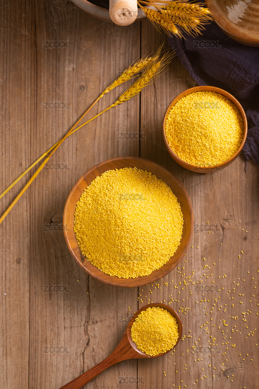 传统中式复古场景中装在木盘中的黄小米俯拍