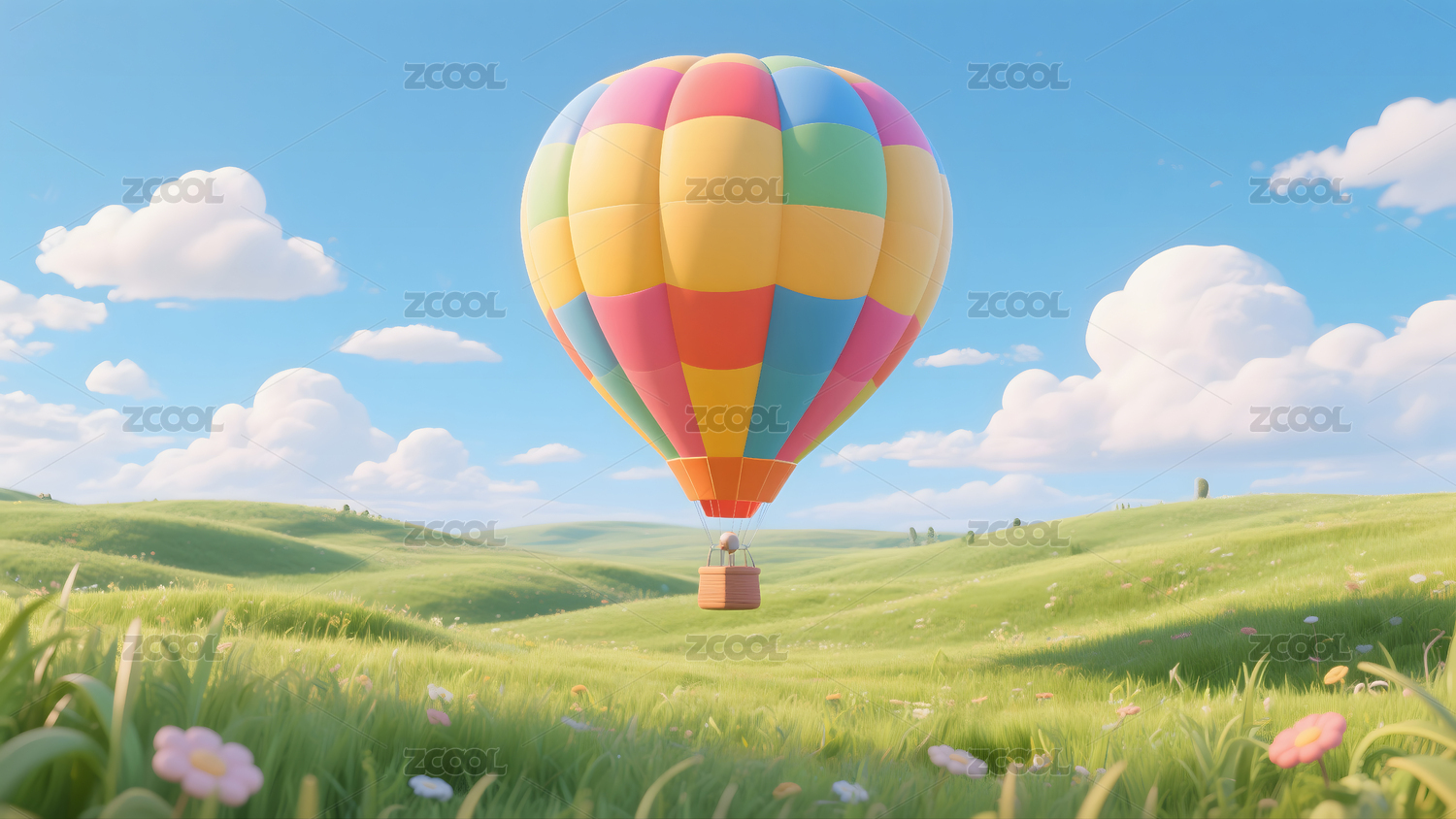 3D草地热气球蓝天白云