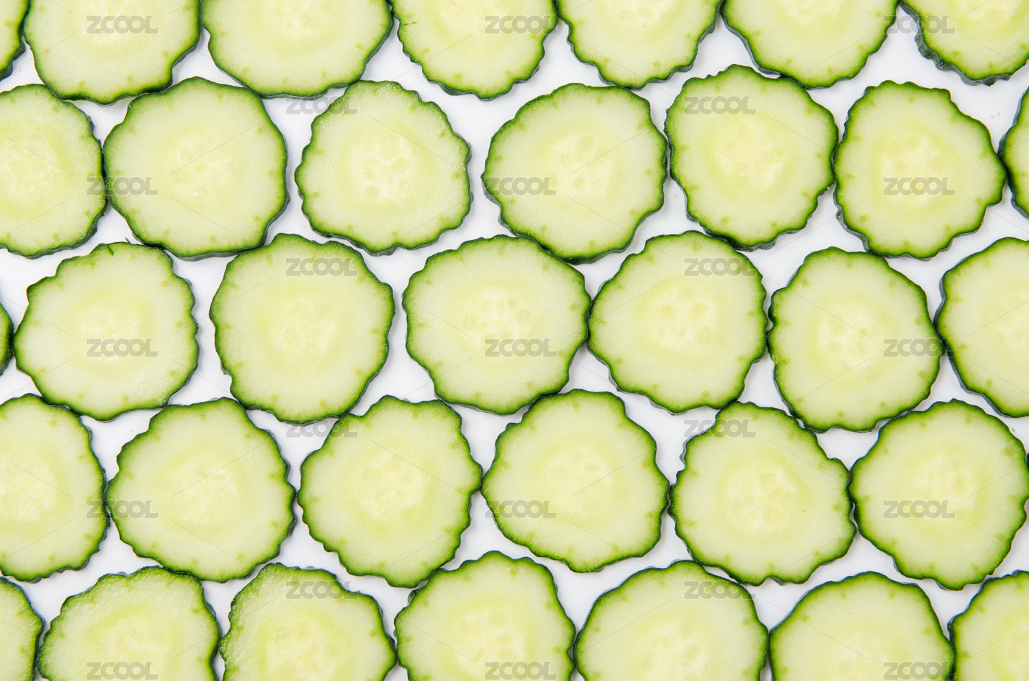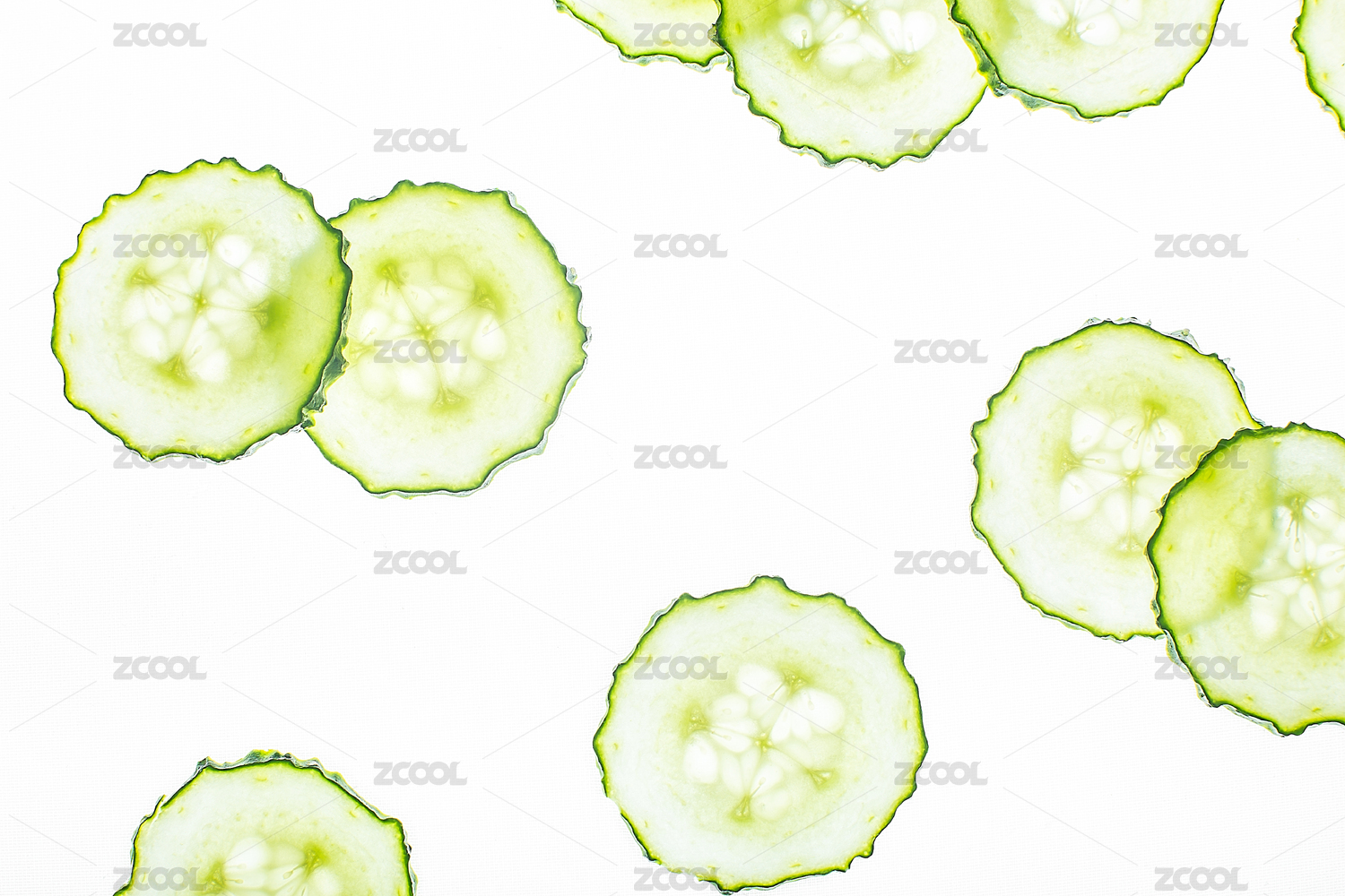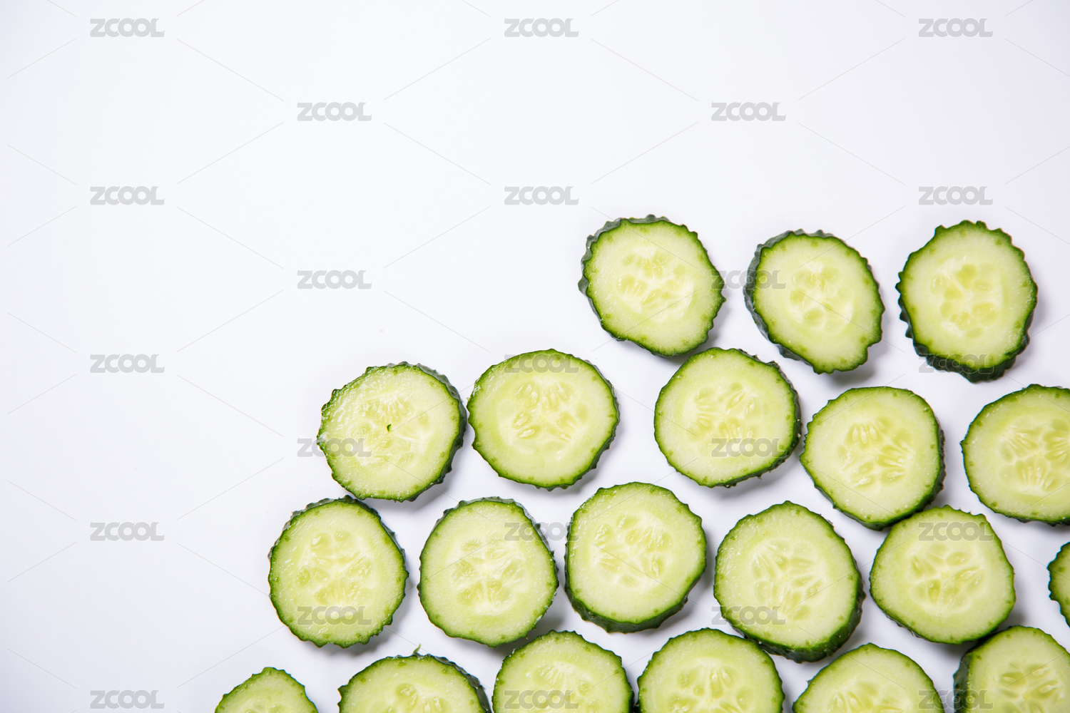 白背景黄瓜切片特写,夏日清凉护肤主题。
