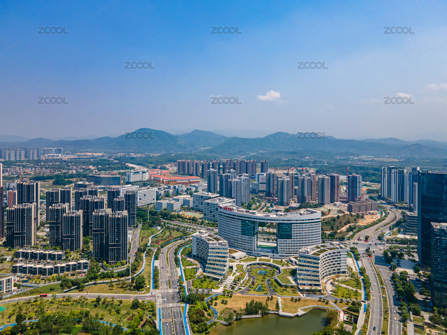 广州萝岗香雪商业建筑群城市天际线航拍全景