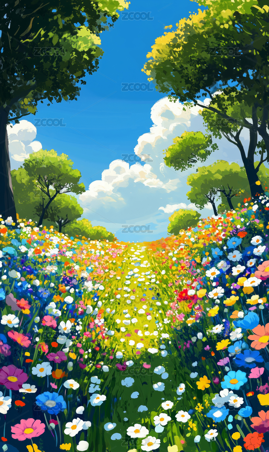 绿树鲜花田野抽象插画海报背景