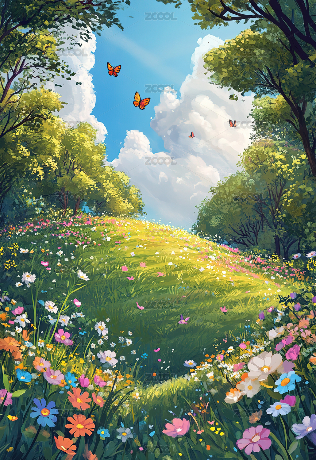户外草地野花森林天空风景插画