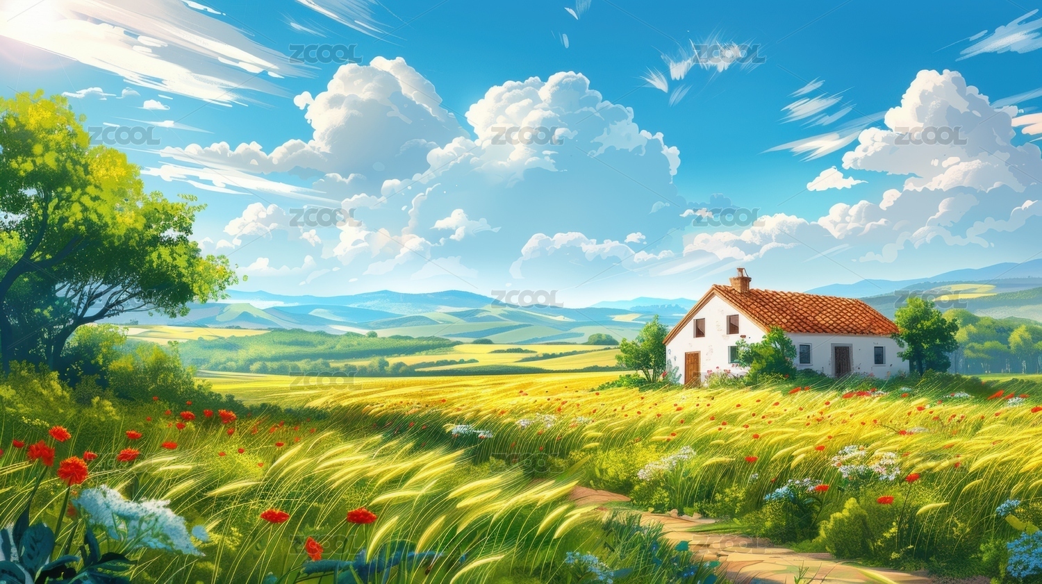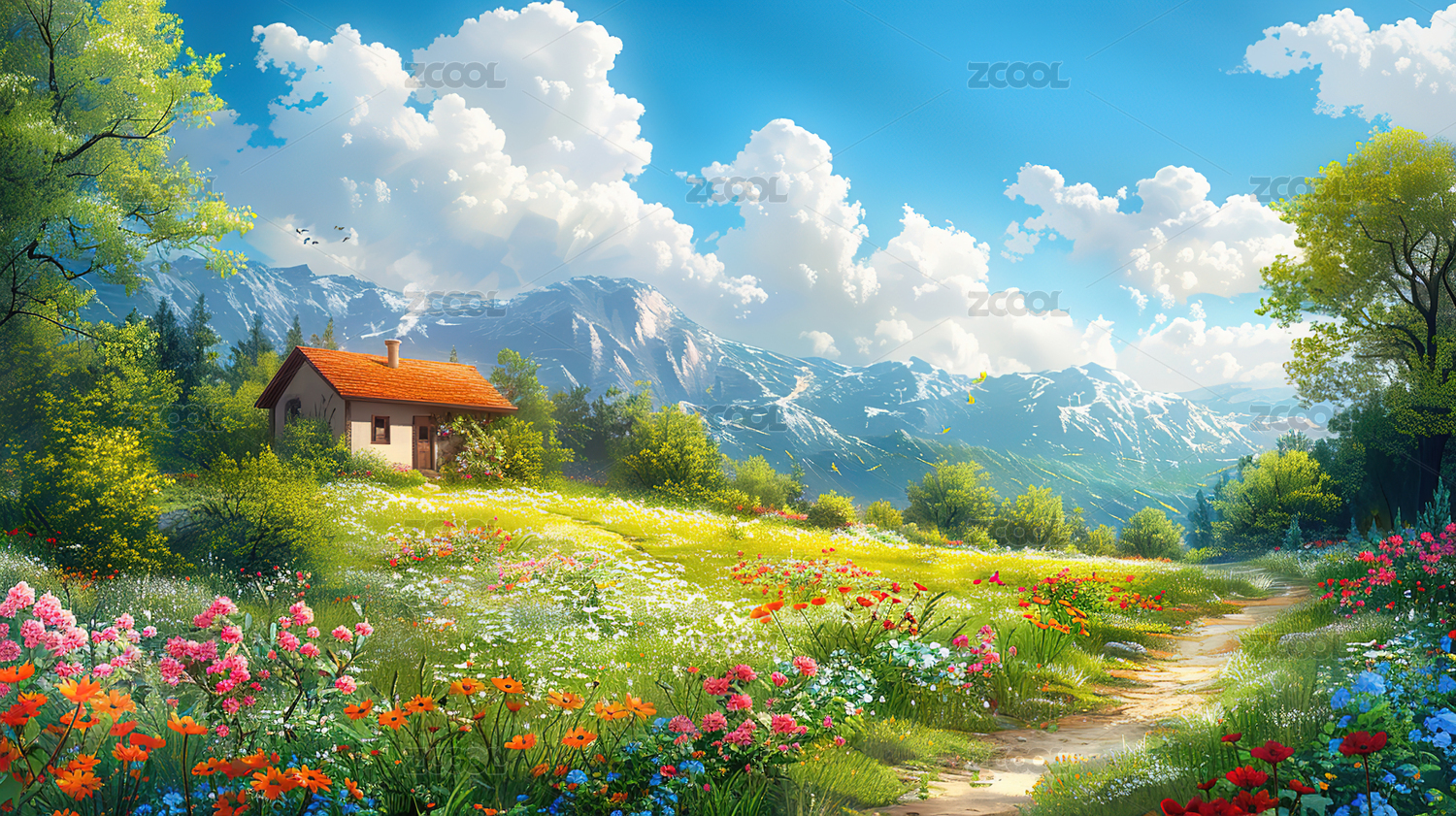 夏天户外旅行山峰房屋乡村风景蓝天白云插画