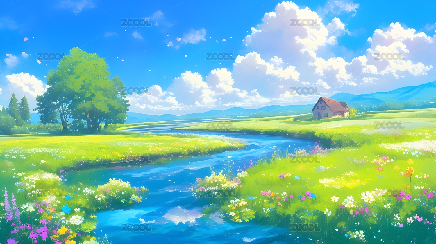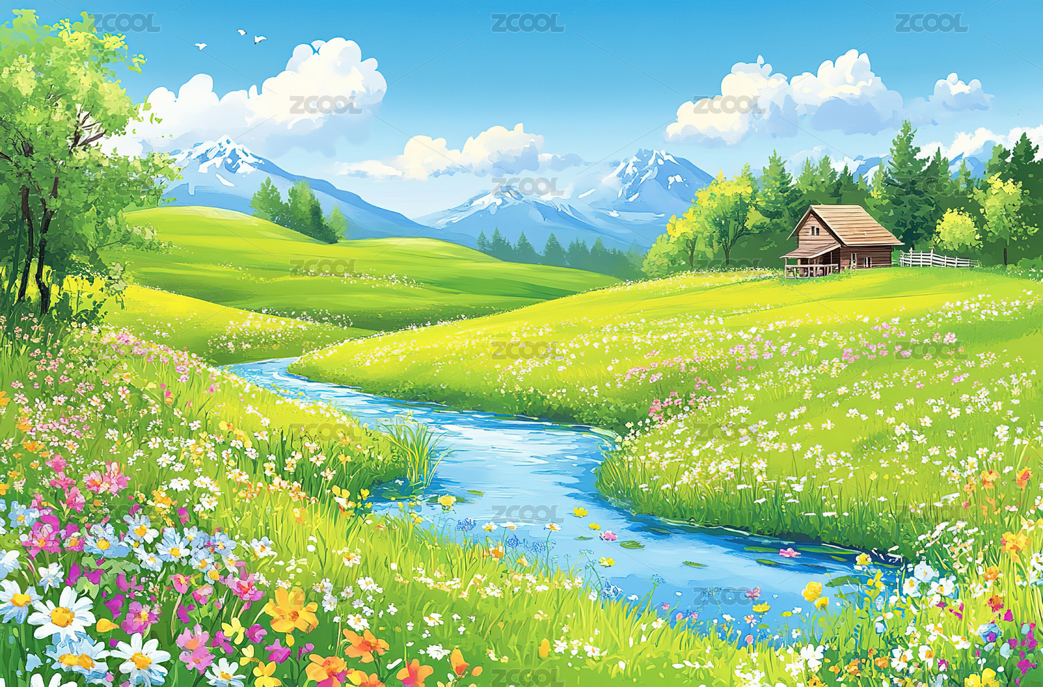 自然,水车,田园,翠绿,五彩,宁静,野花,溪流,草地,风景