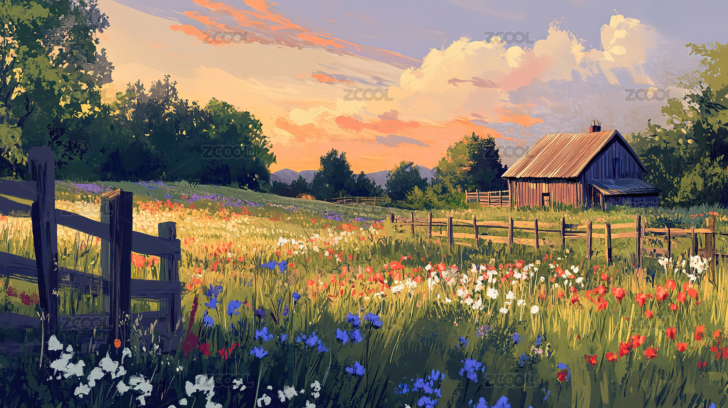 厚涂粗笔触印象派梦幻鲜花海岸景观背景海报