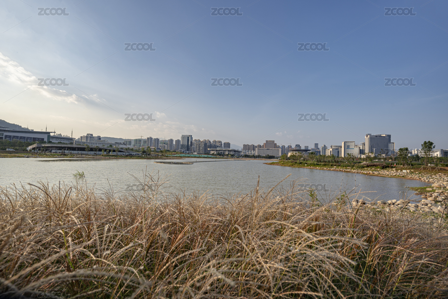 福建省龙岩市龙津湖公园湖畔的芦苇与建筑