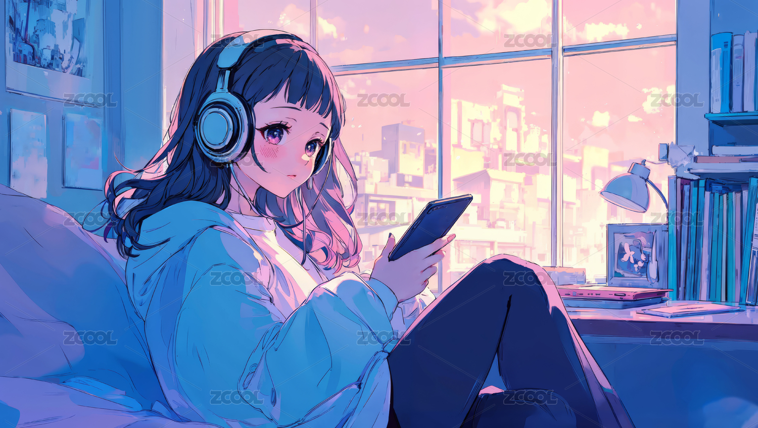 清新明亮戴耳机亚洲清纯女孩扁平动漫插画