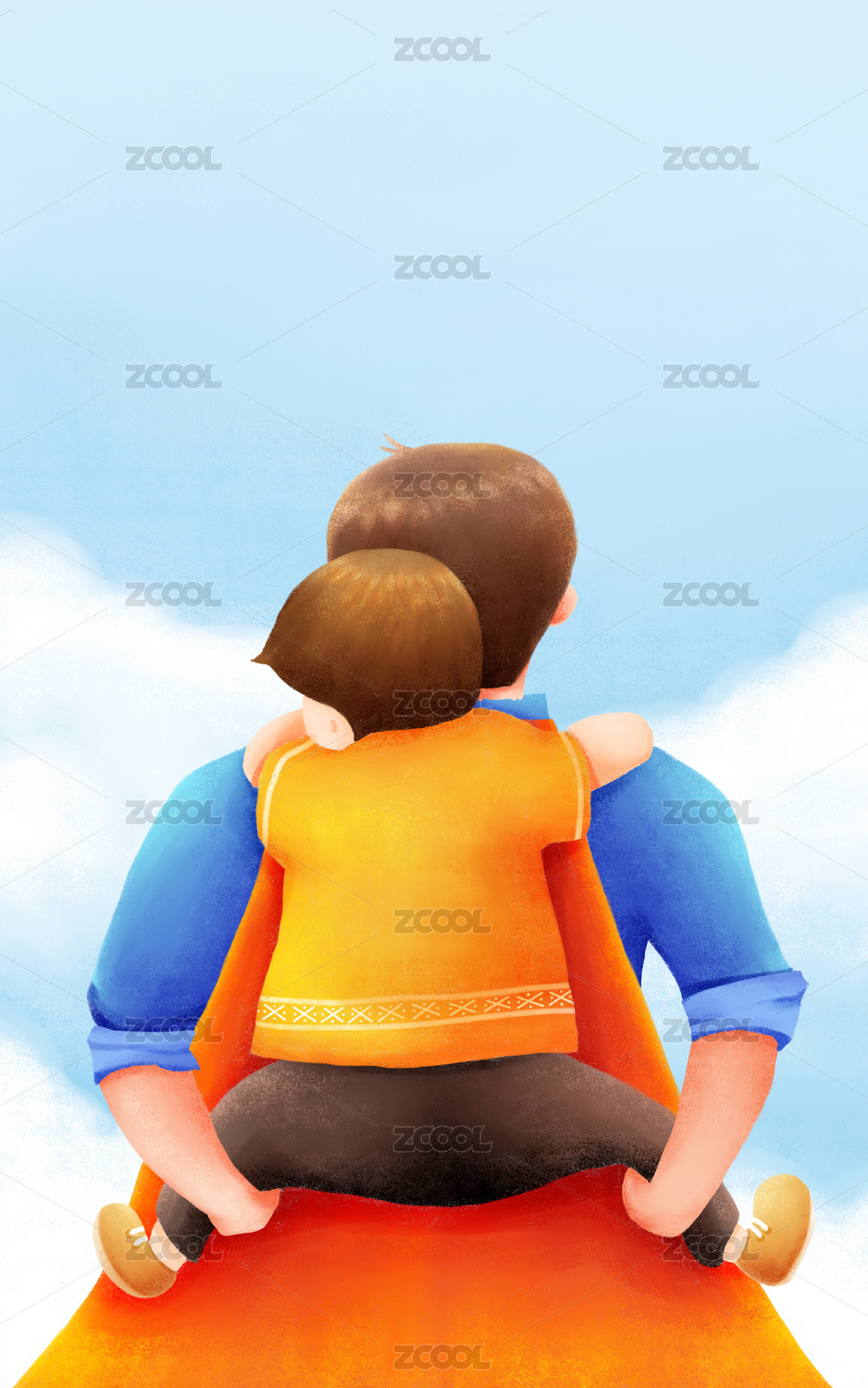 身披超人披风的男人背着小男孩 父亲节主题