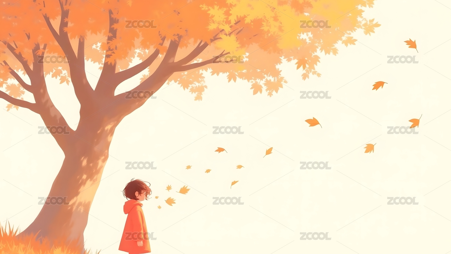 秋日树下小女孩与落叶