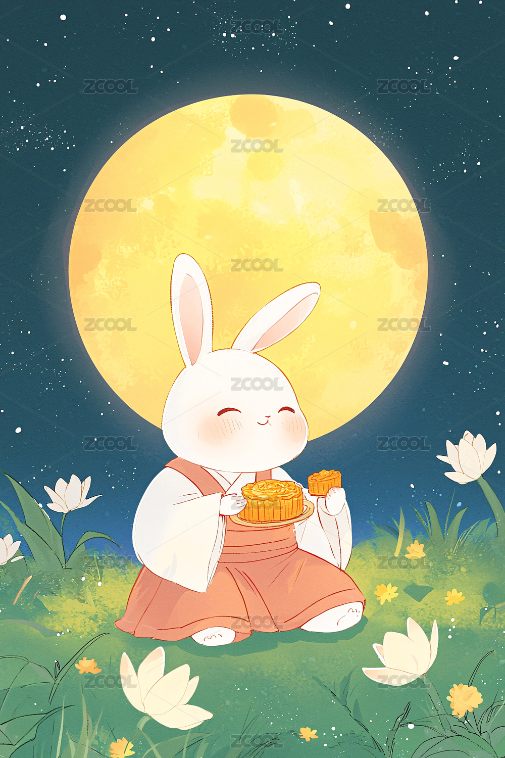 中秋节月亮玉兔抱着月饼赏月场景概念插图