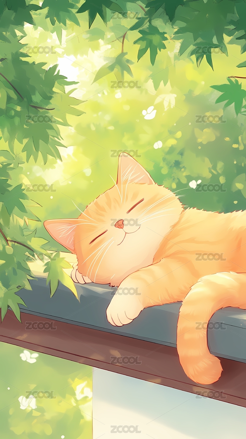 一只橙色猫咪在枫树底下睡觉
