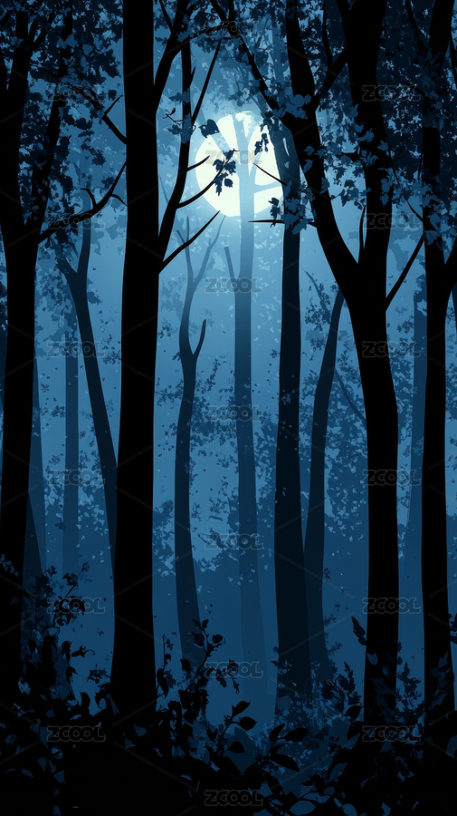 蓝色森林里的月亮和树木风景插画