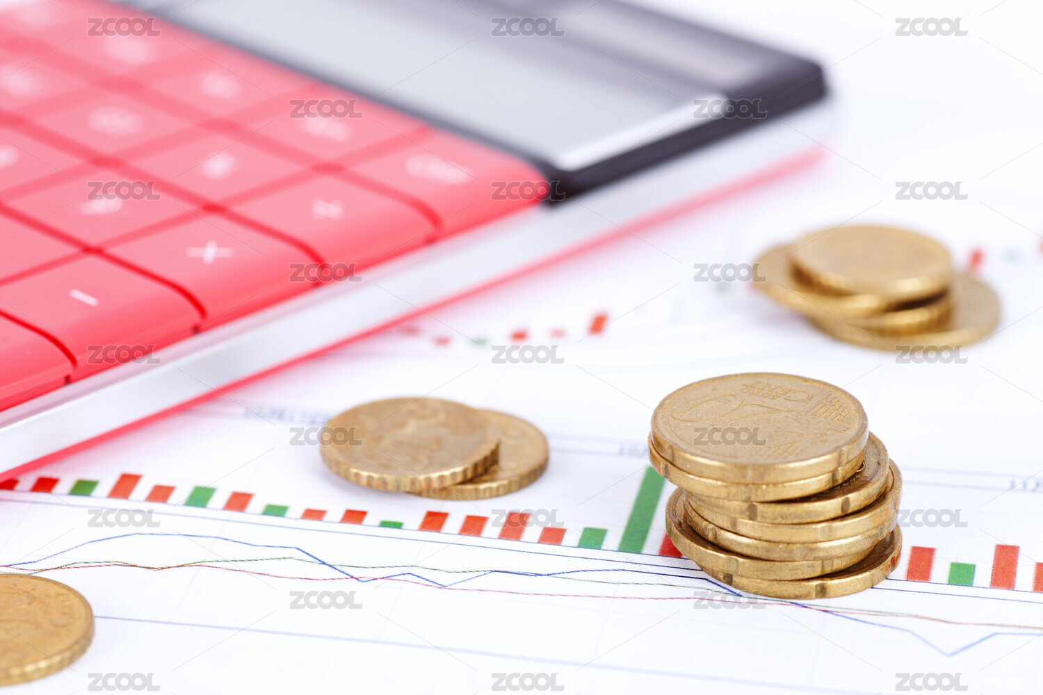 个人理财。 财务报告。 钱硬币和计算器在商业数据表上
