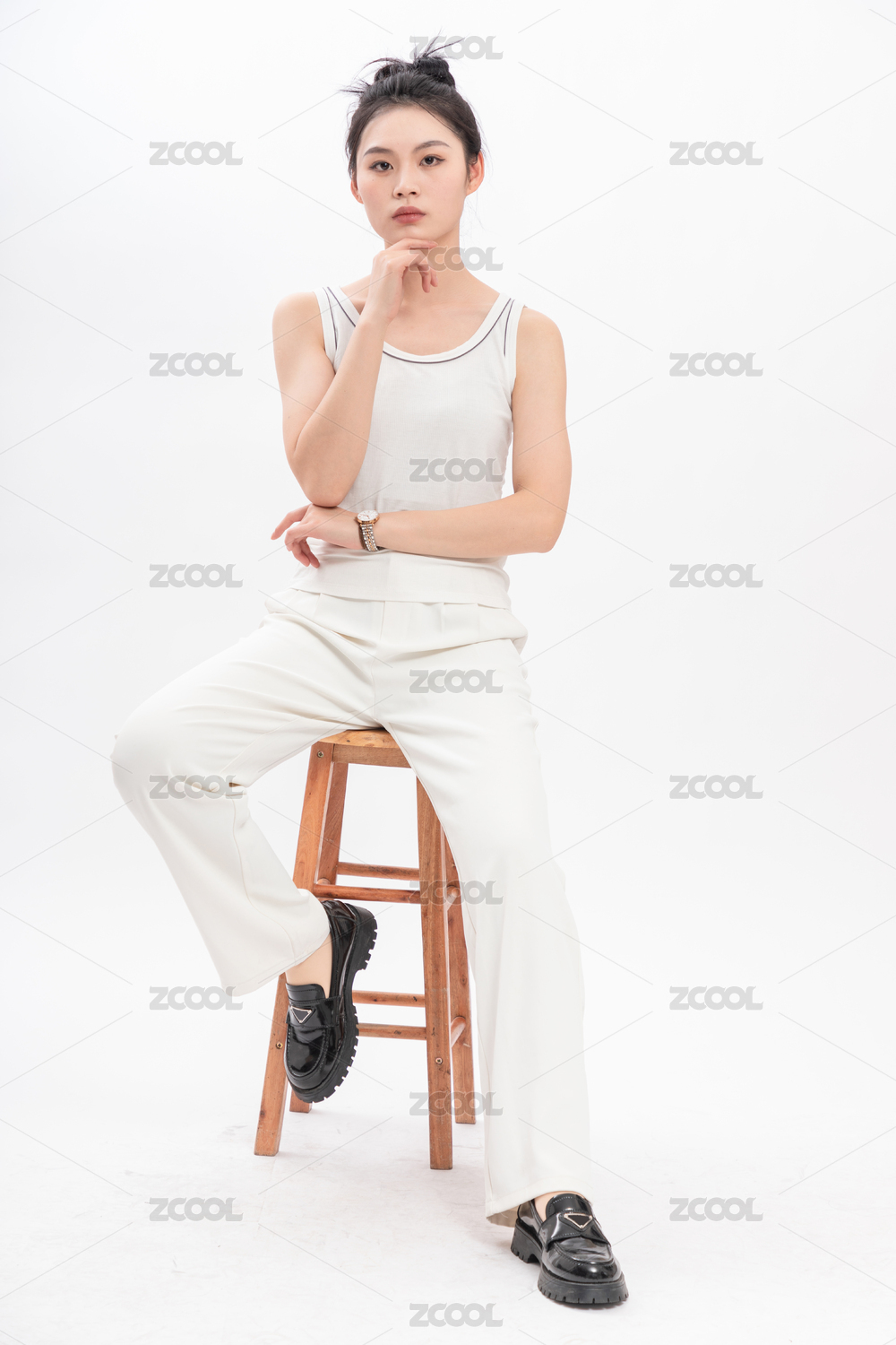 白色背景下坐在凳子上的女性肖像