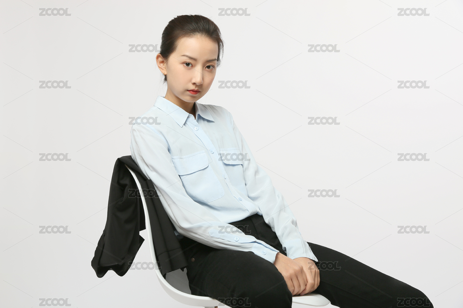 身穿正装的中国女人坐在白色墙前单手插兜