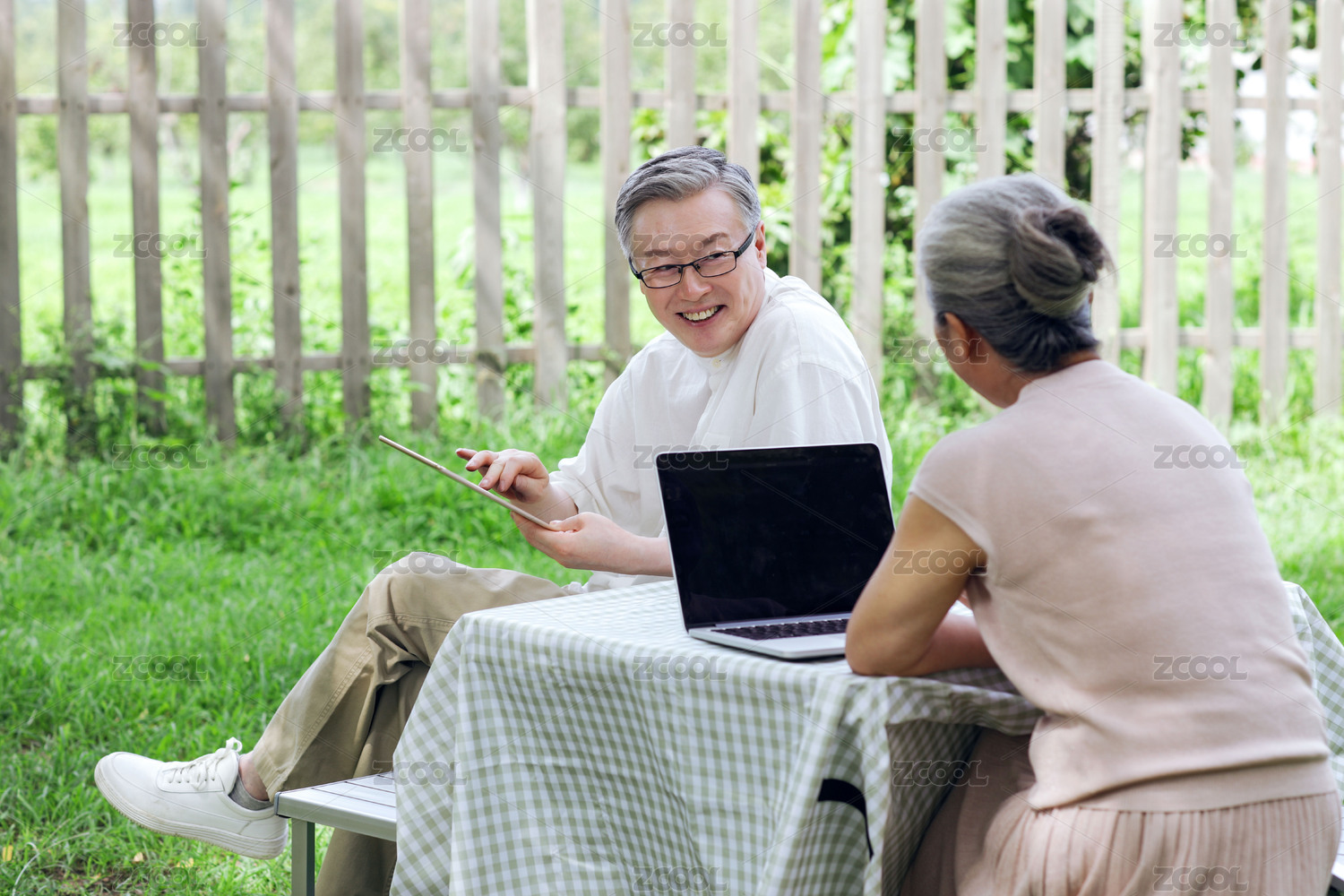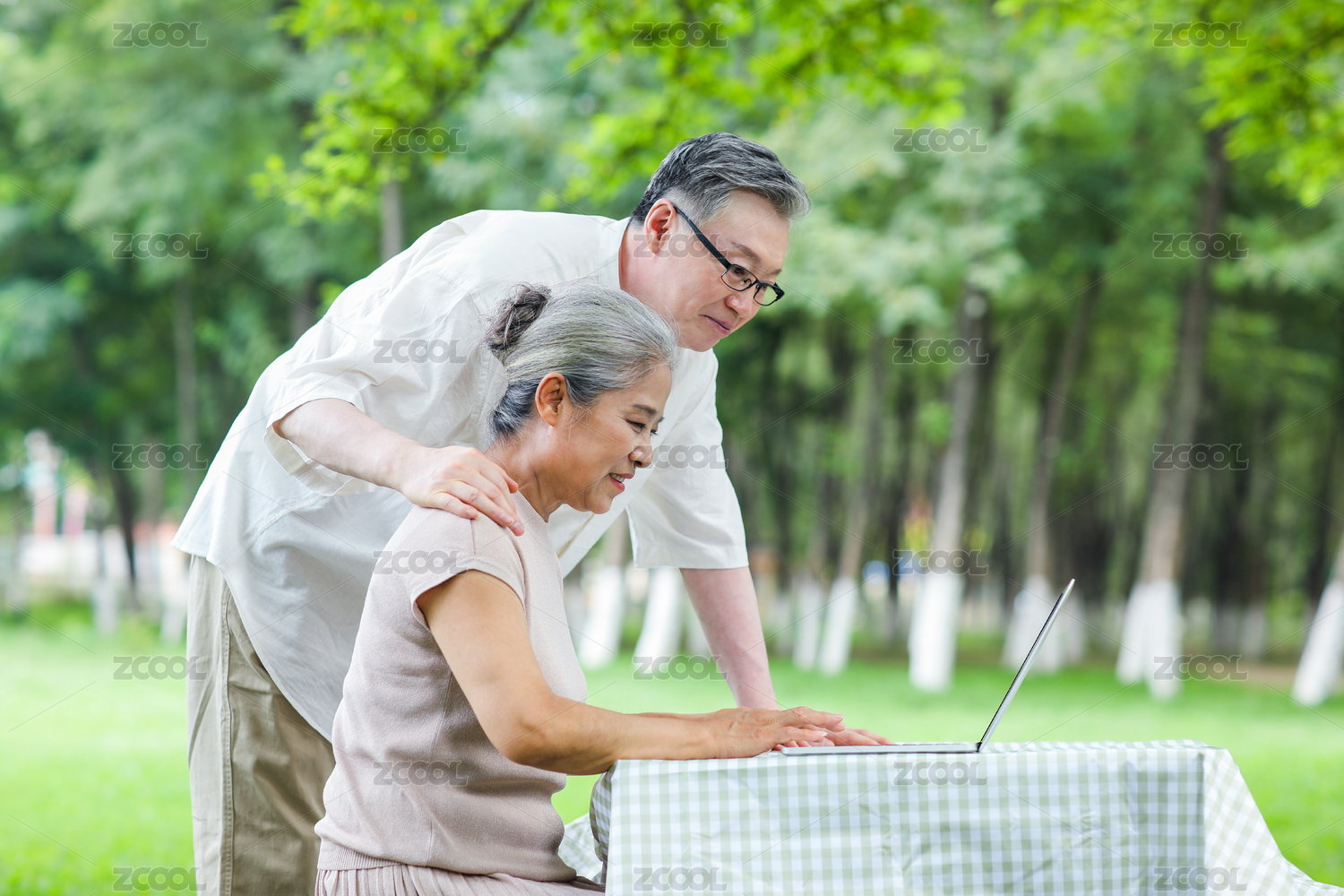 一对亚洲的老年夫妻在椅子上使用笔记本电脑