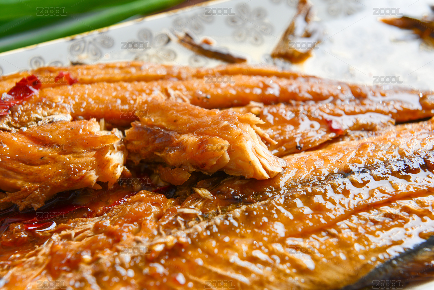 木头桌面上盘子里的干鲅鱼马鲛鱼肉