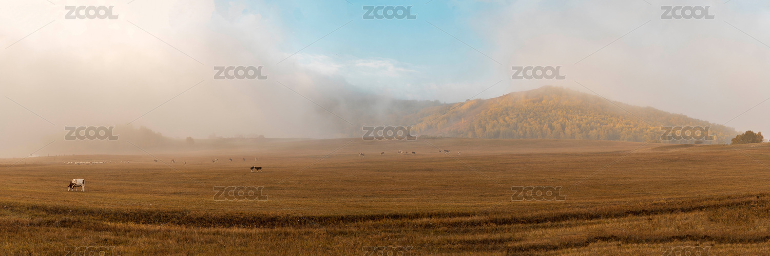 中国新疆禾木雾中金黄色的秋牧场
