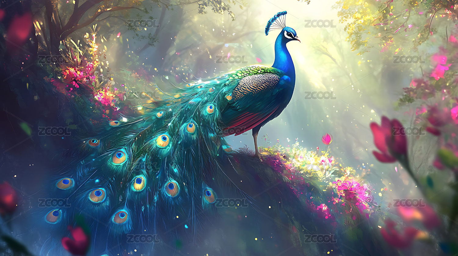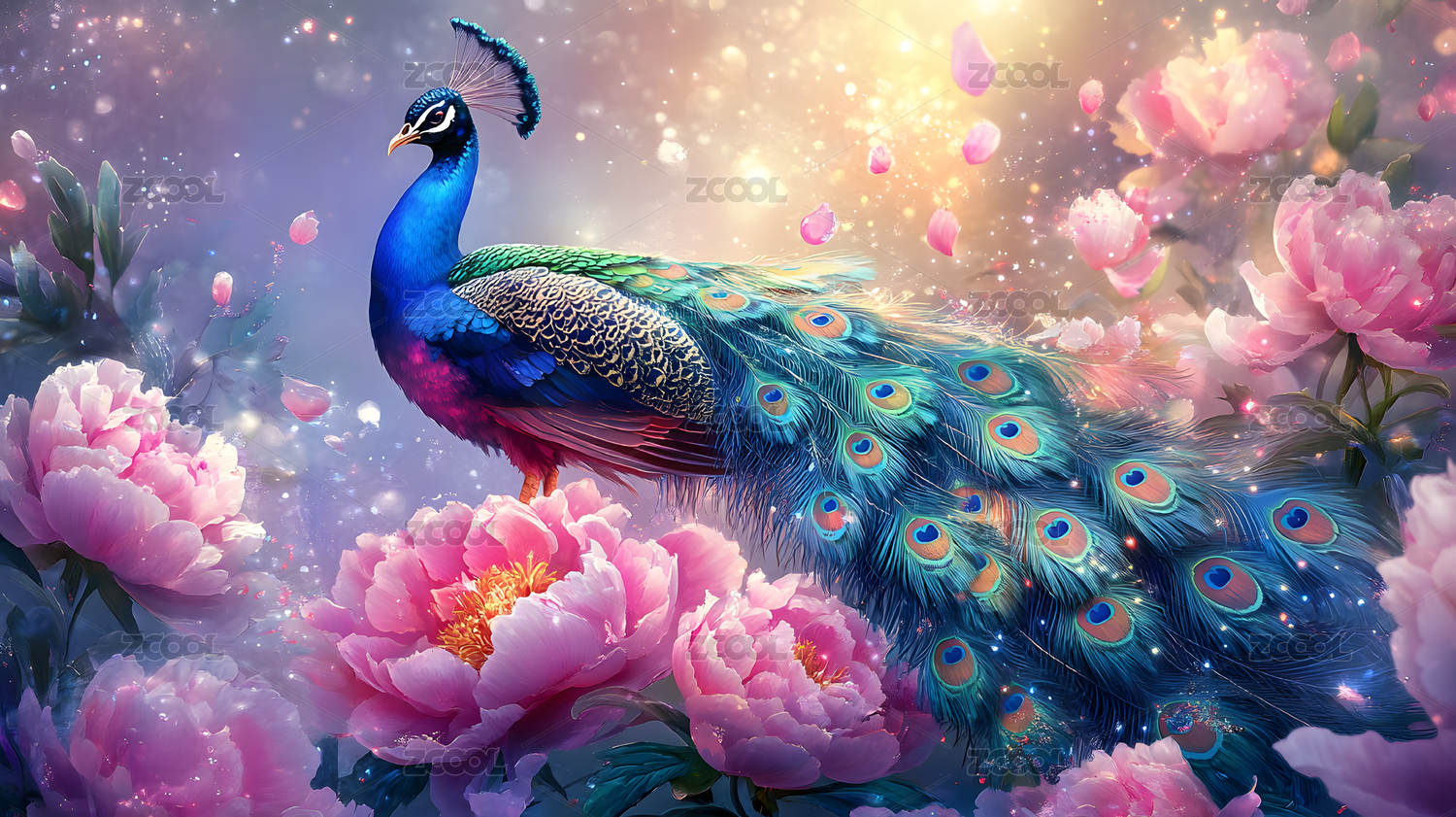 aigc,华丽,孔雀,花卉,图案,蓝色,绿色,羽毛,金色,高贵