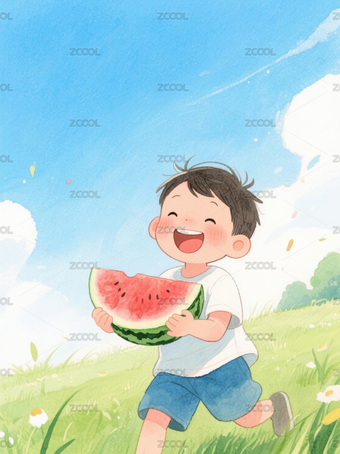 卡通人物,西瓜,吃,夏日,户外,享受,太阳,蓝天,云朵,清新