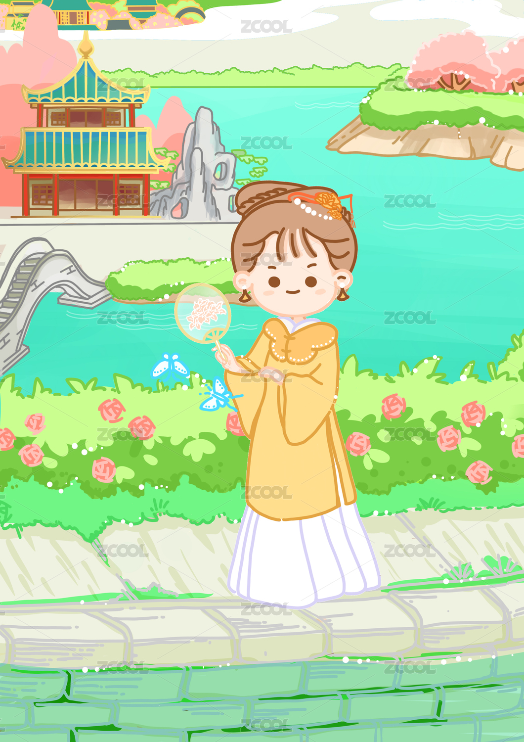 红楼梦系列薛宝钗扑蝶卡通插画场景