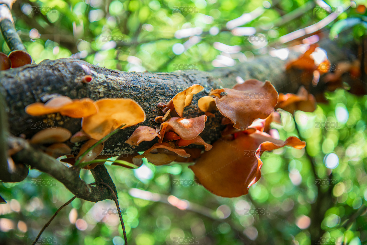 丛林里藤蔓与绿叶中的枯枝上的野生木耳