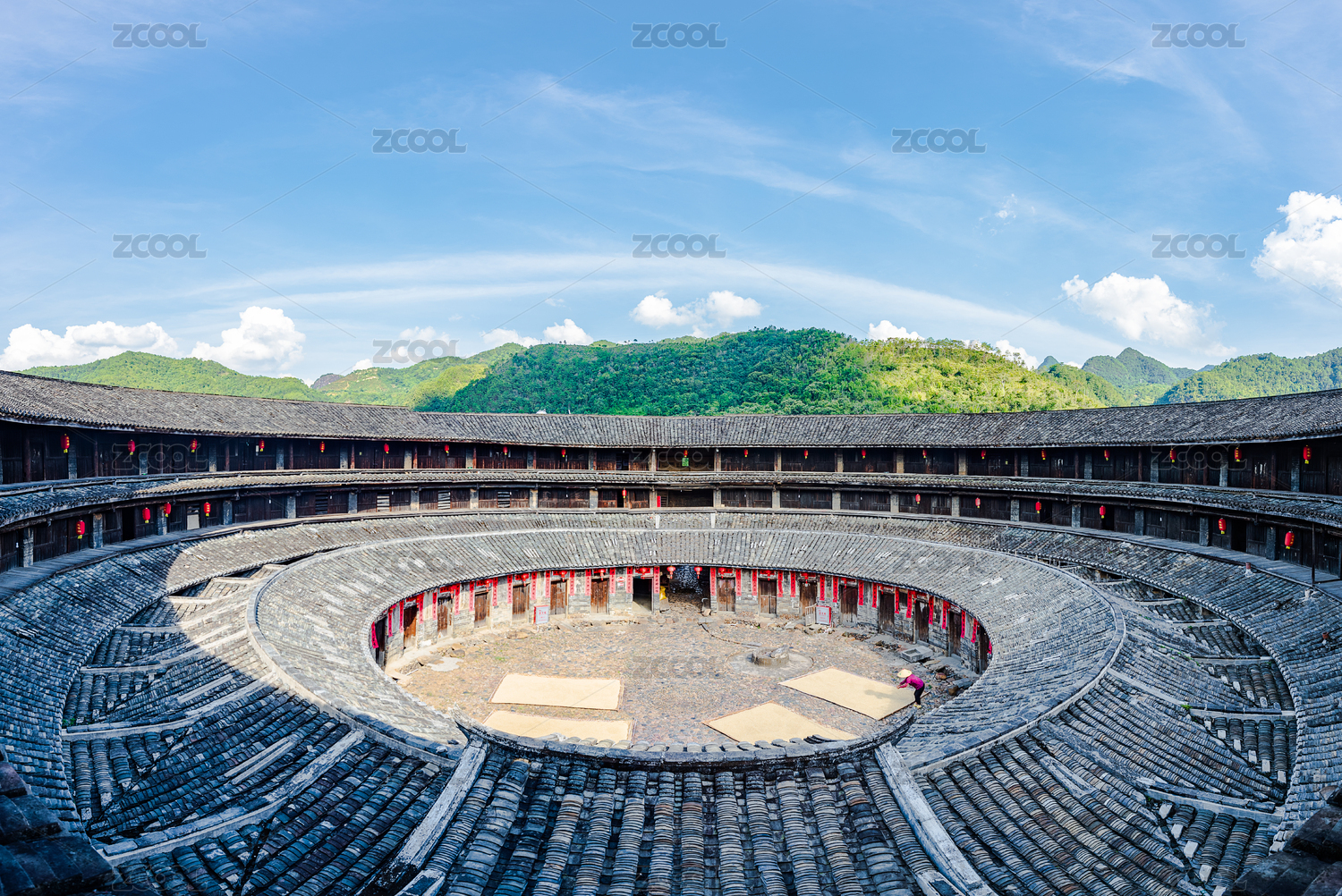 蓝天白云下的客家土楼美景