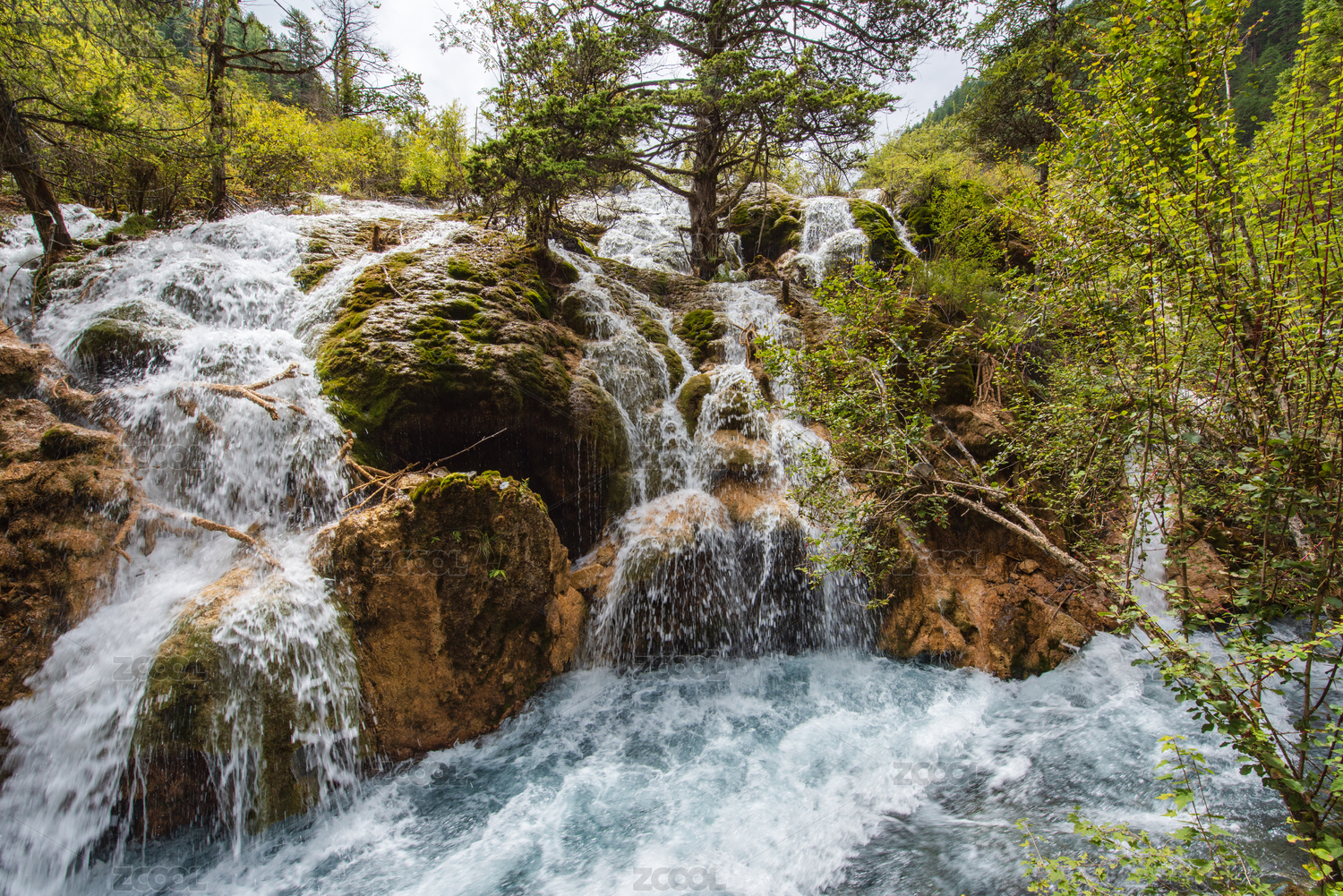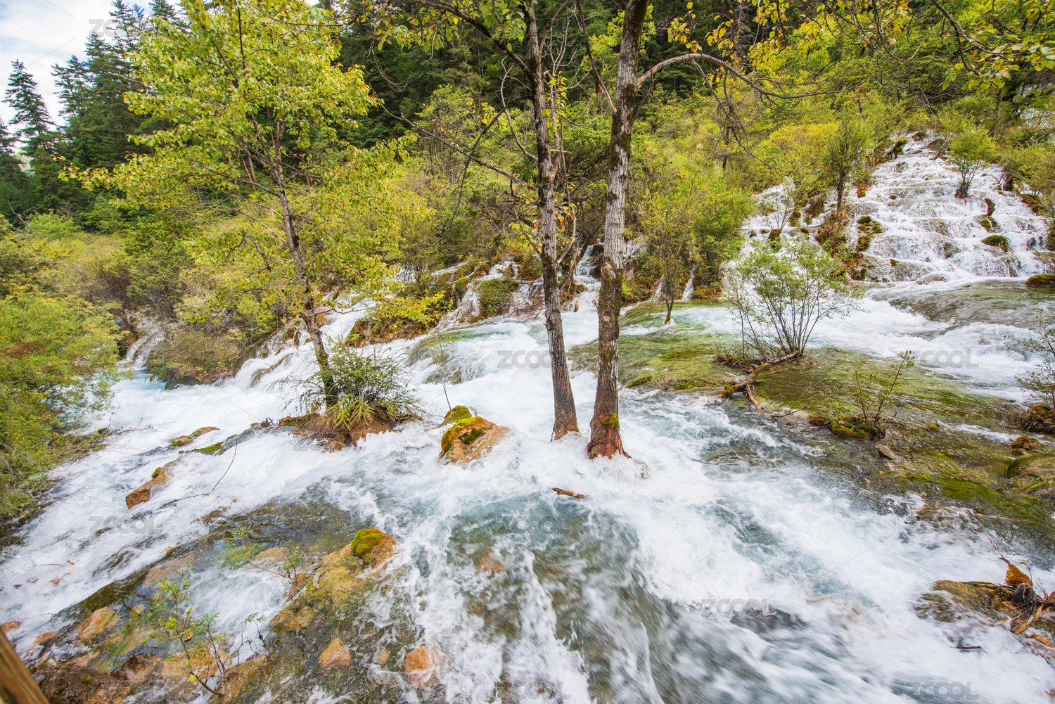 四川,九寨沟,瀑布,水流,白色,树木,晴天,白云,钙华,落差