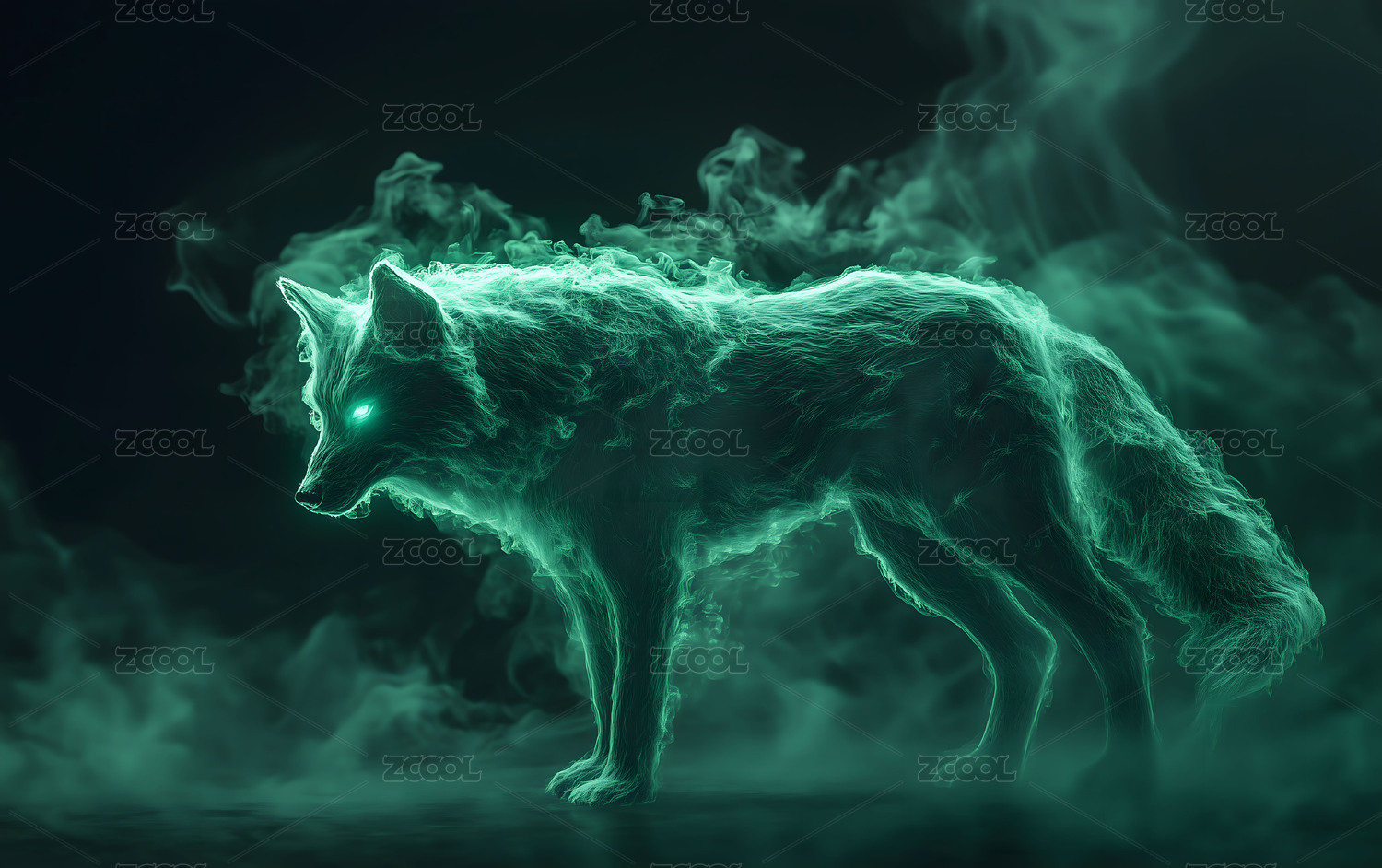 元宇宙数字成像一只散发绿色荧光的狼背景