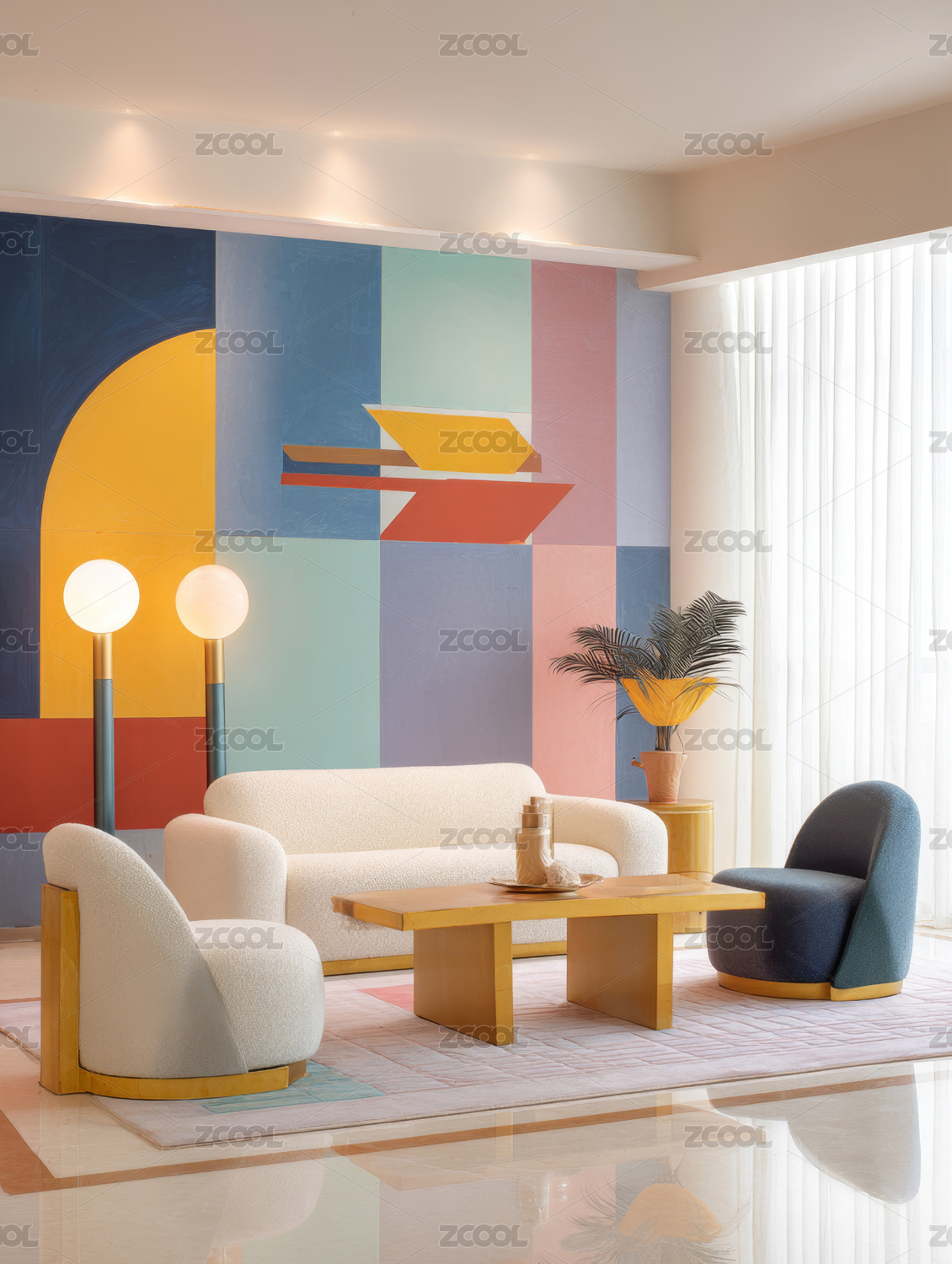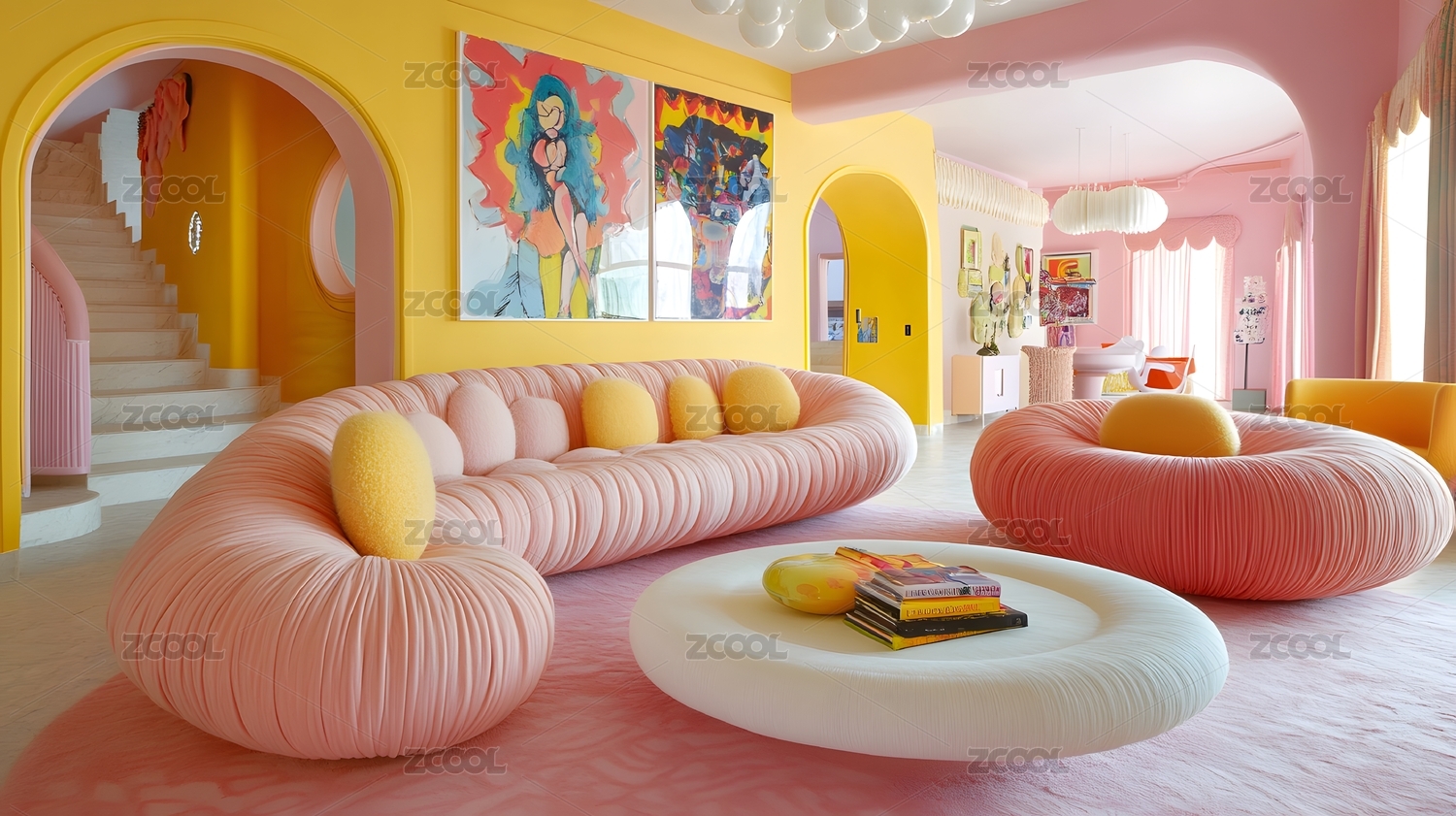 3D彩色卡通孟菲斯风格客厅三维空间场景
