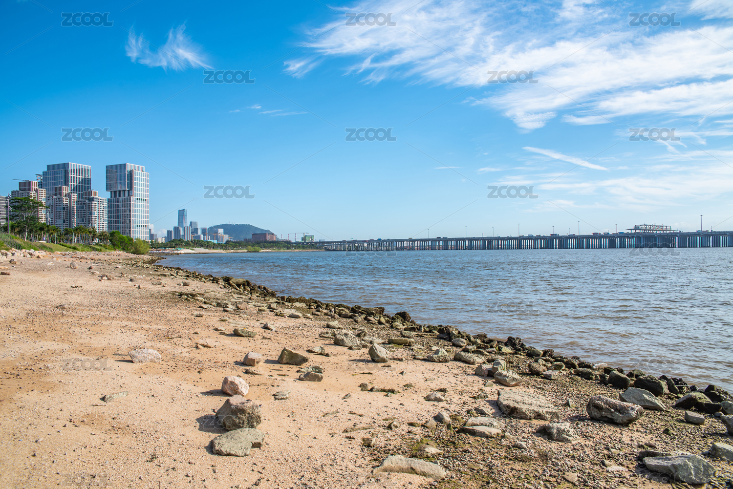 中国广东省珠江口海面上的虎门大桥和货柜船