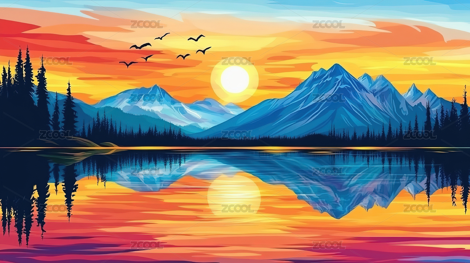 唯美的雪山湖泊插画背景