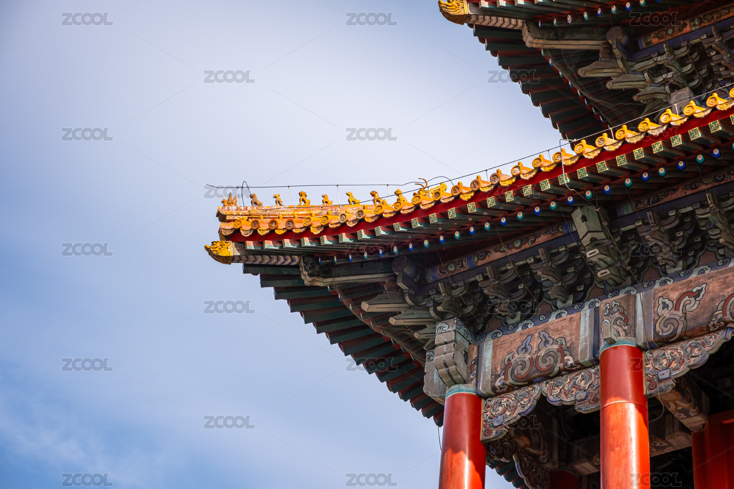 中国北京景山公园古建正面一角—琉璃瓦屋顶飞檐彩绘描金万字纹龙纹