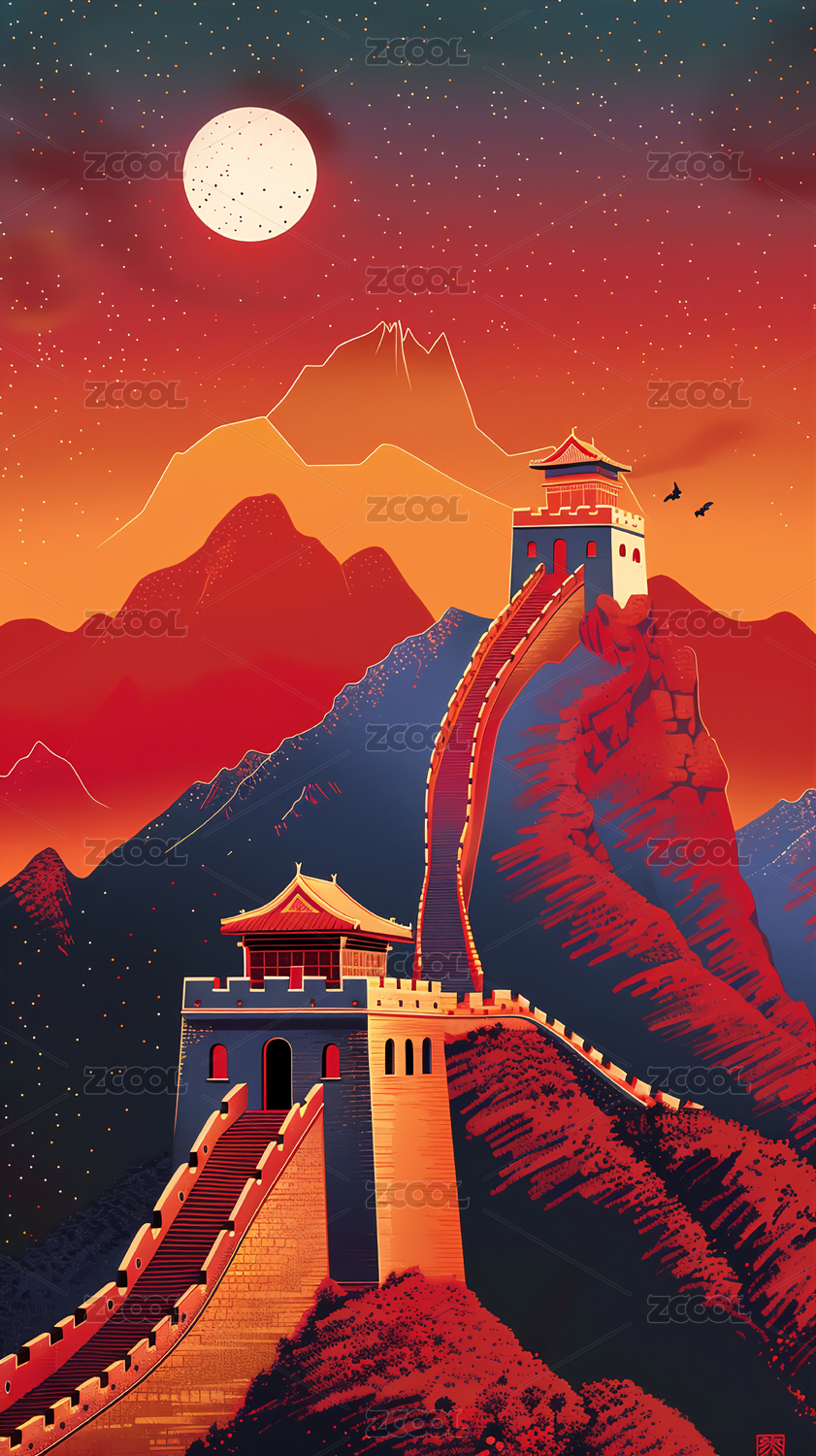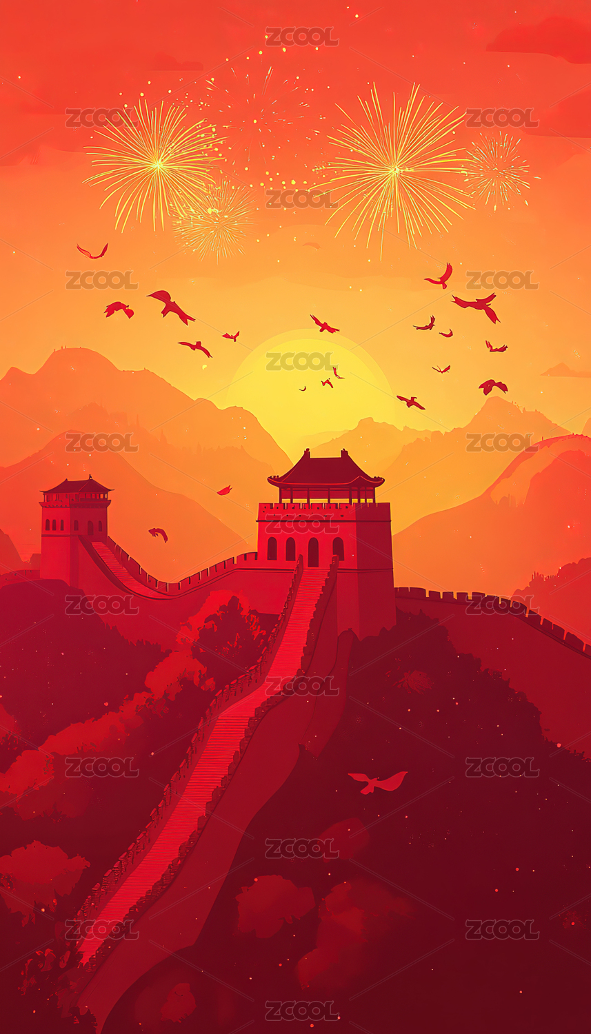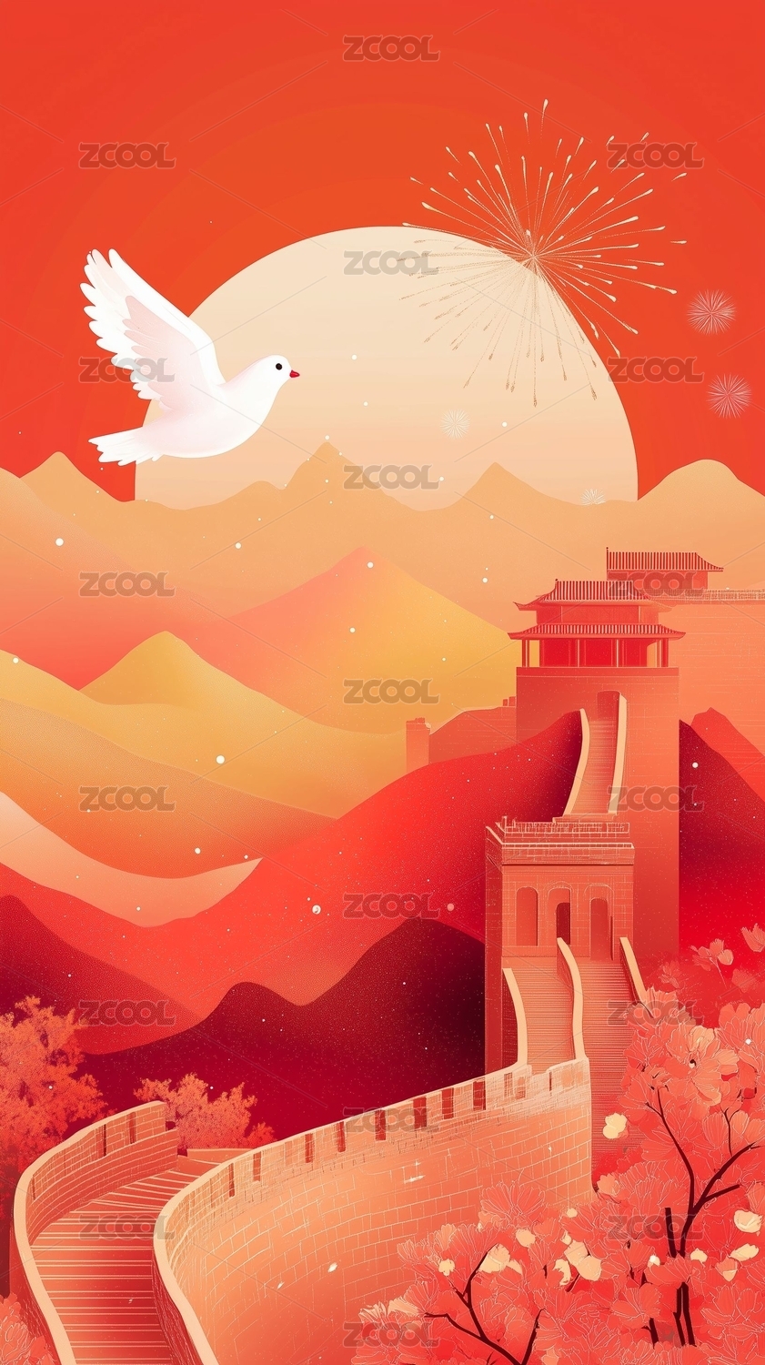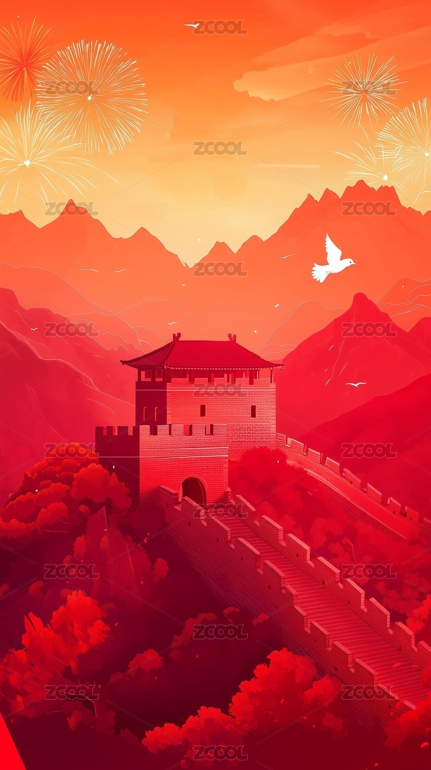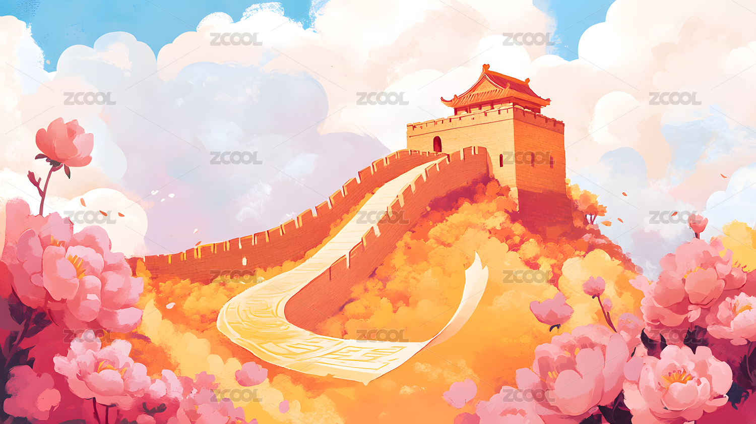 国庆节,节日,旅游,景点,长城,插画,卡通,花,天空,山
