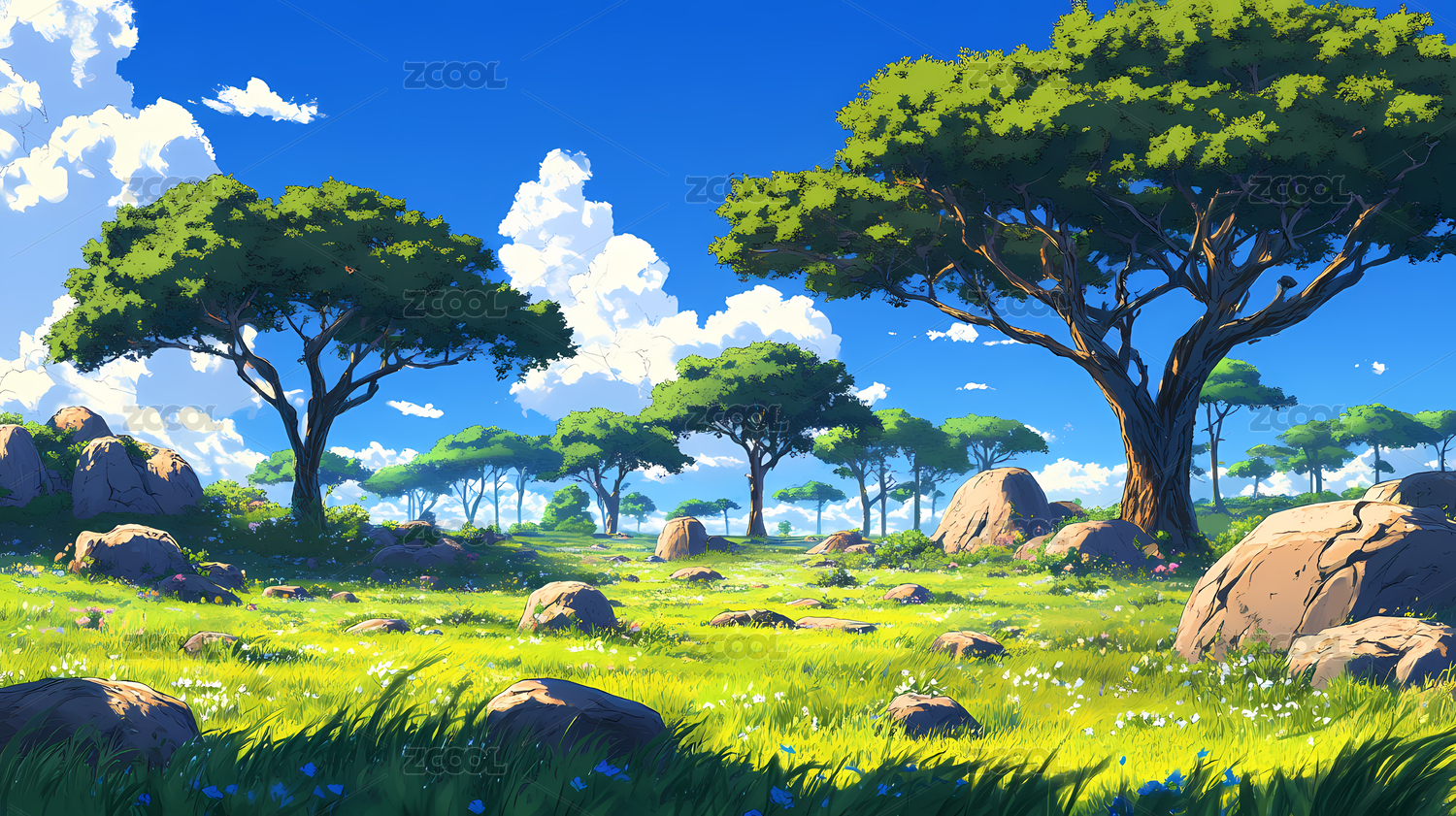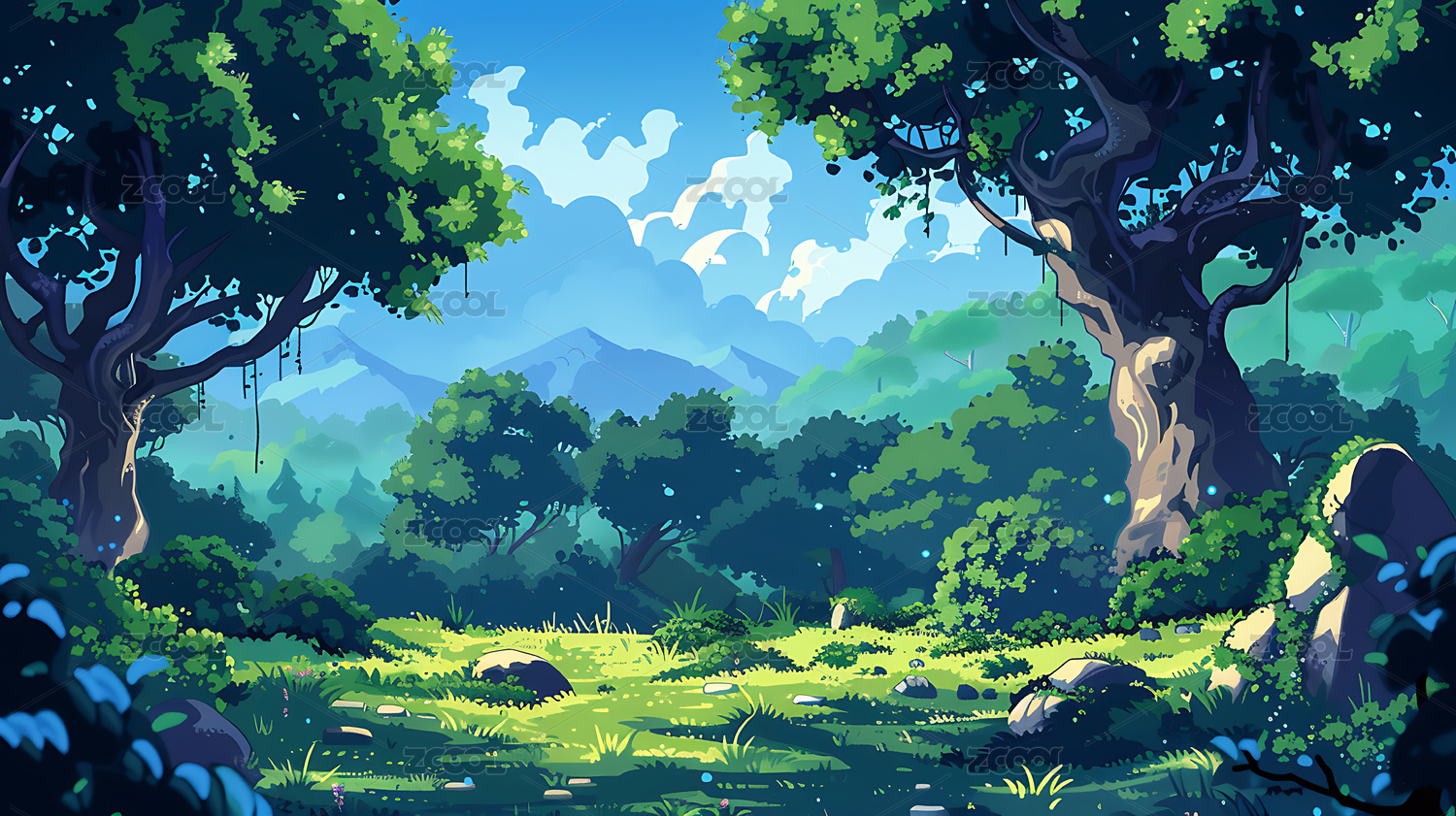 治愈系童话绘本风格郊外绿色的风景壁纸
