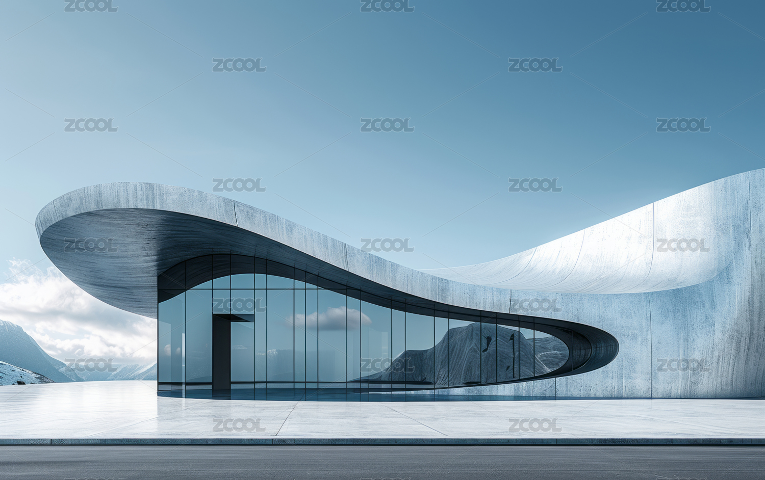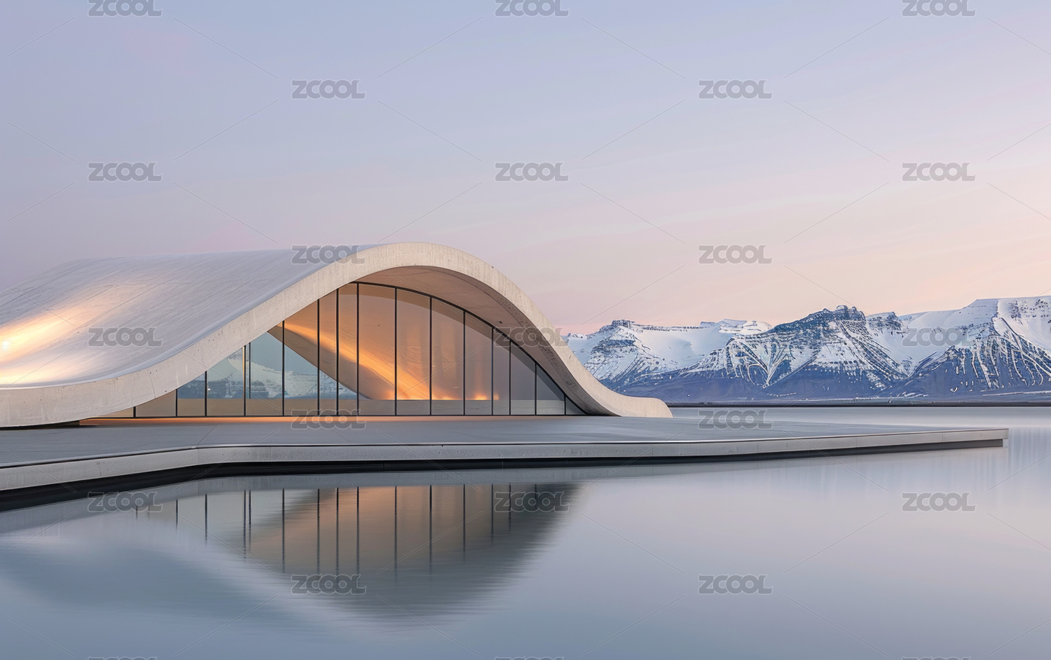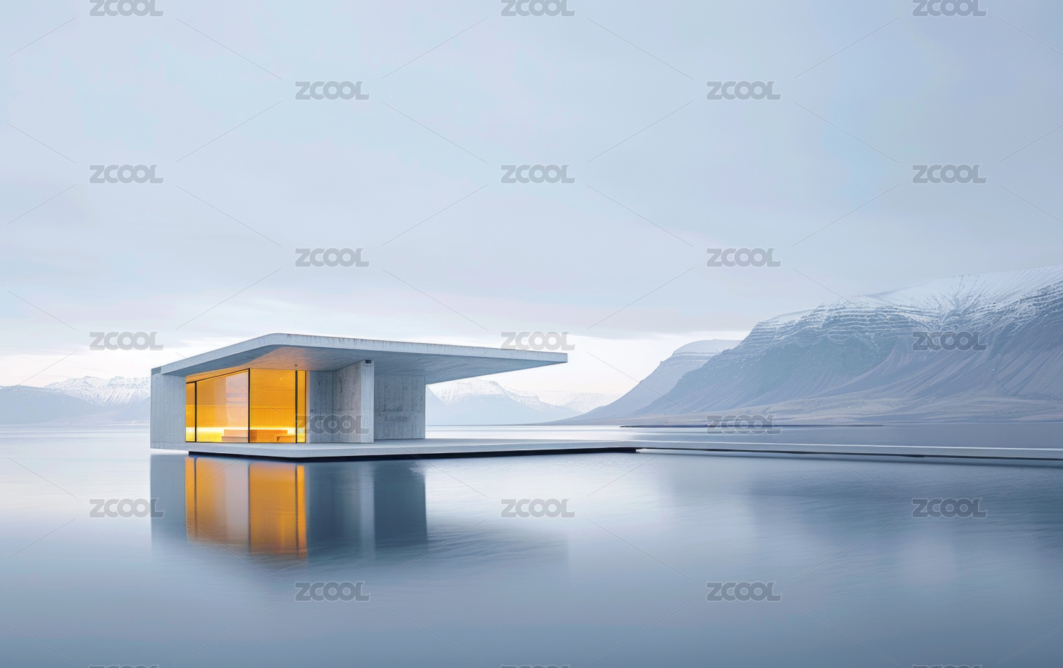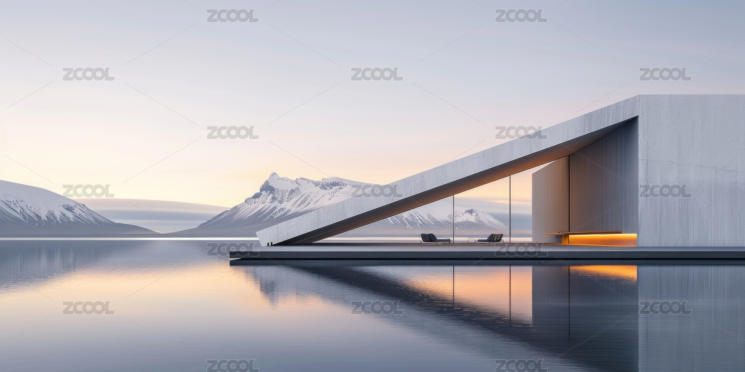 湖边现代简约科幻的未来感概念山水建筑
