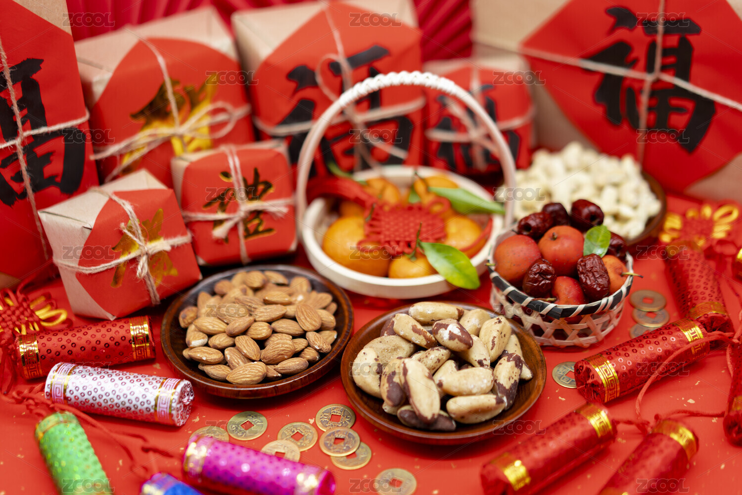 春节坚果福袋红色背景图