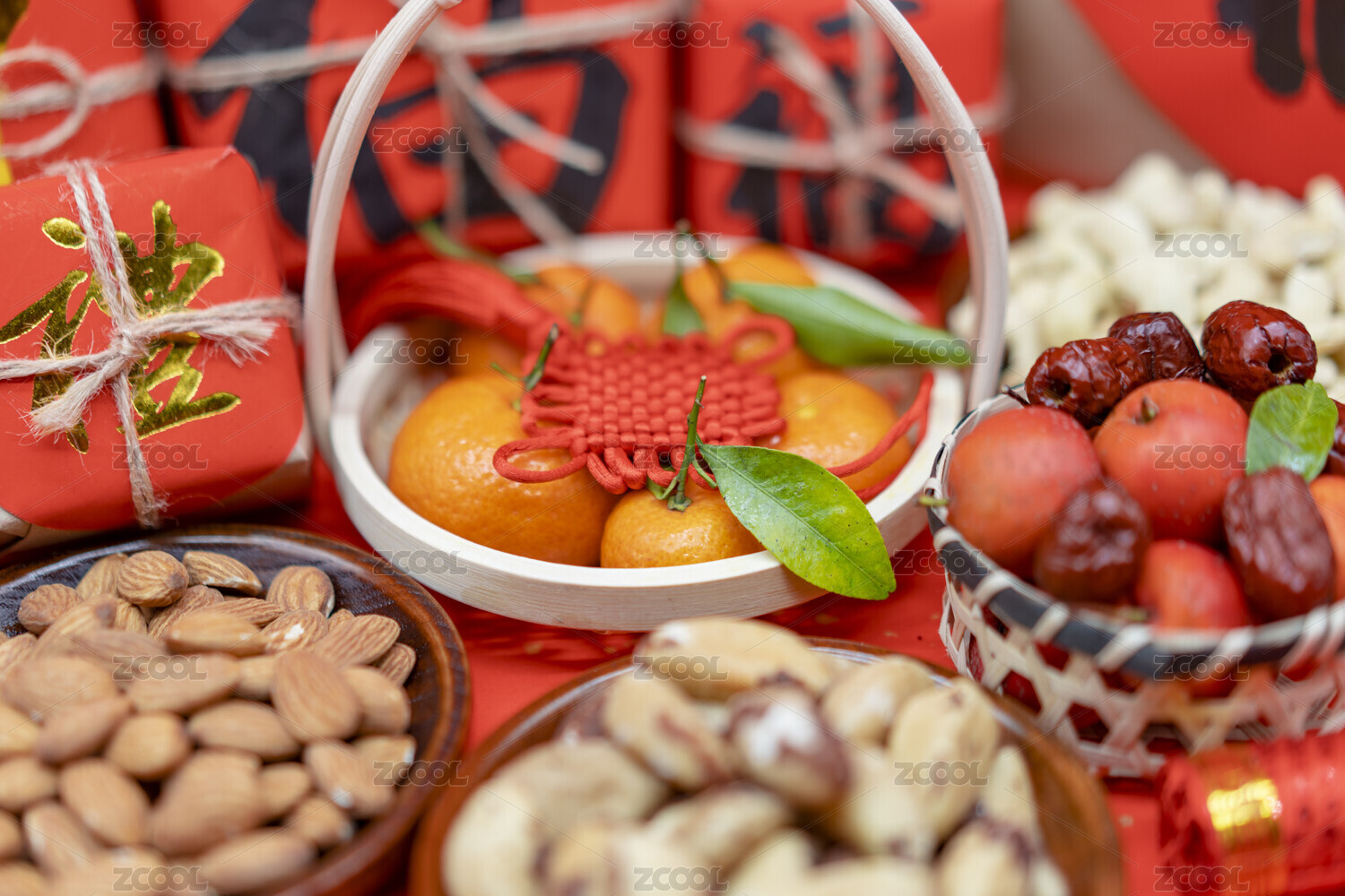 喜庆的新年年货果盘与福气挂饰