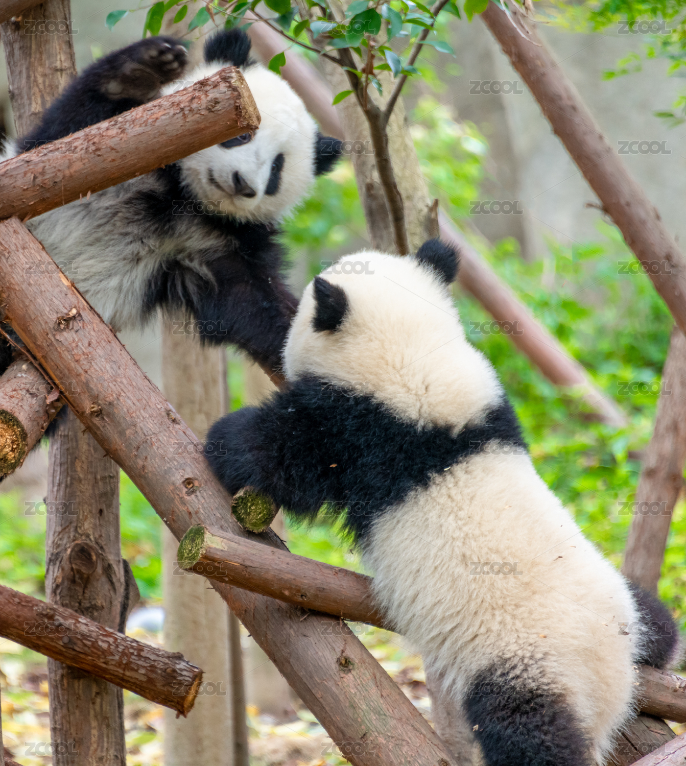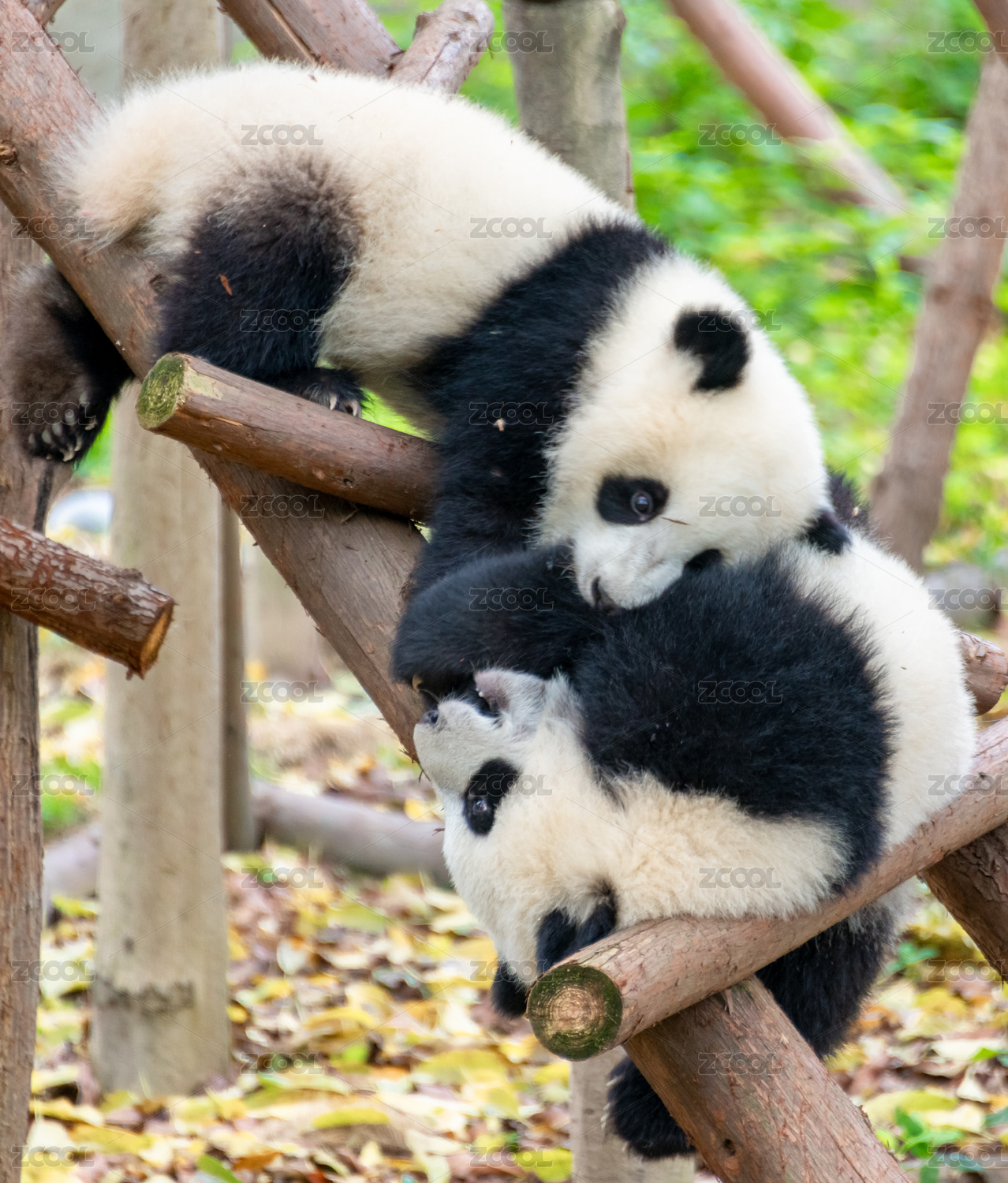 正在玩耍的两只幼年大熊猫