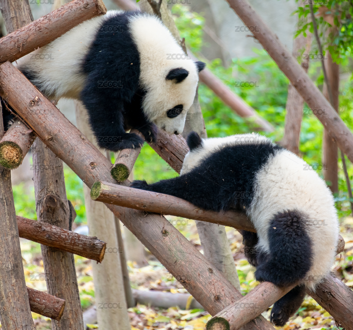 成都大熊猫繁育研究基地两只大熊猫幼崽玩耍