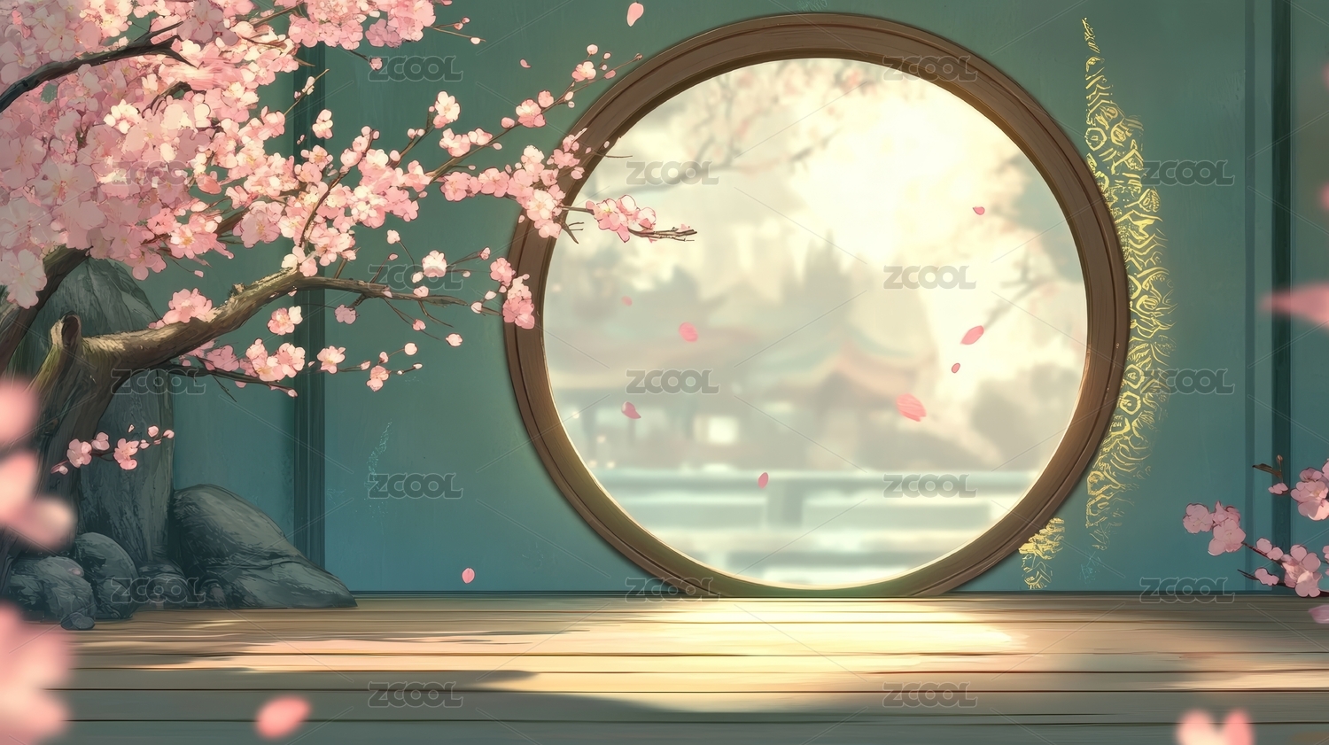 古风桃花庭院窗边唯美蓝色插画背景